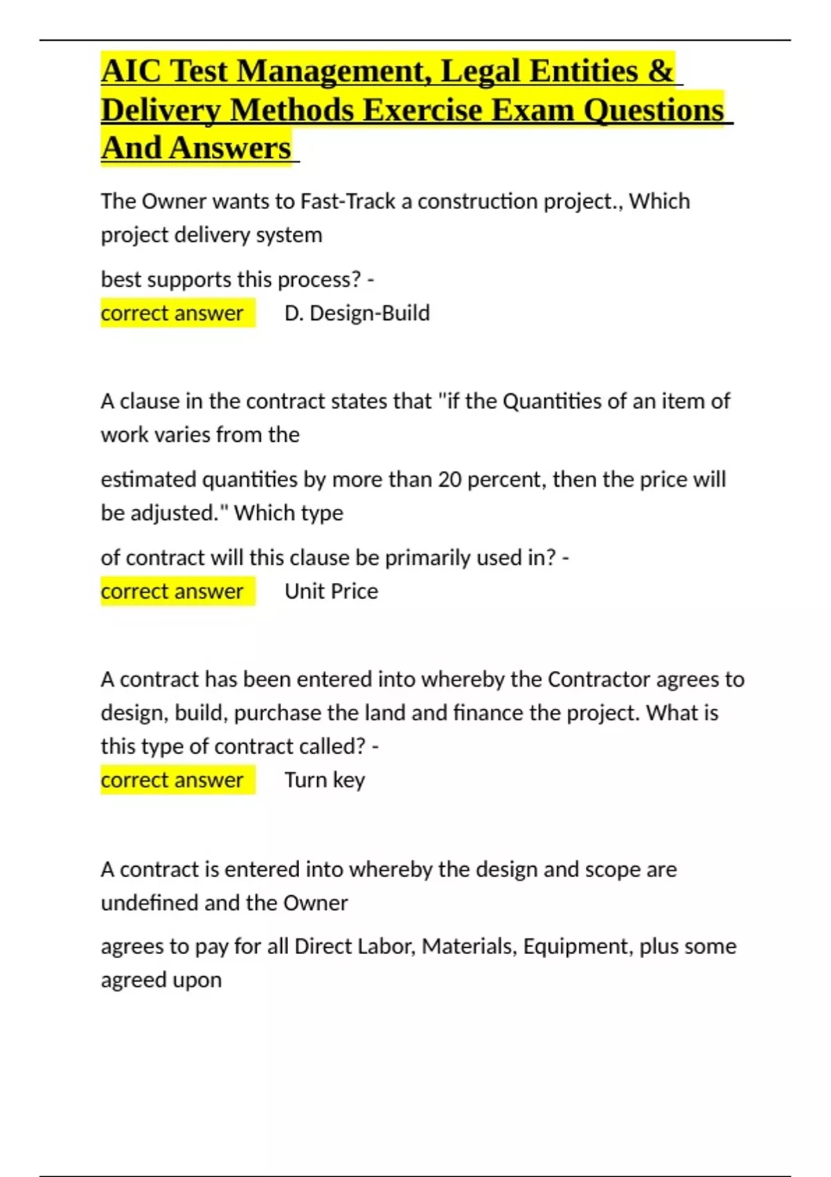 AIC 301 - Expanding Your Claims Perspective Exam Questions And Answers.docx AIC 301 Chapter 1 Understanding the Basics of Contracts Exam Questions And Answers.docx AIC Exam Chapter 8 Construction Safety Exa Questions And Answers.docx AIC Test Management, Legal Entities & Delivery Methods Exercise Exam Questions And Answers.docx