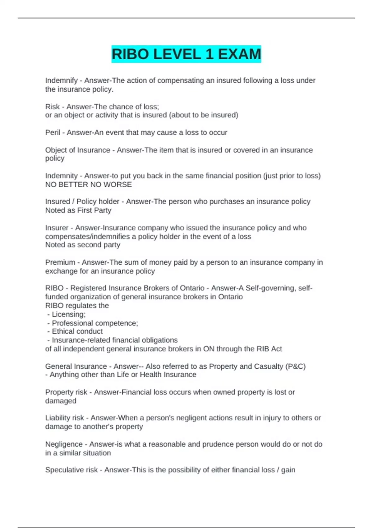 RIBO LEVEL 1 EXAM QUESTIONS AND ANSWERS