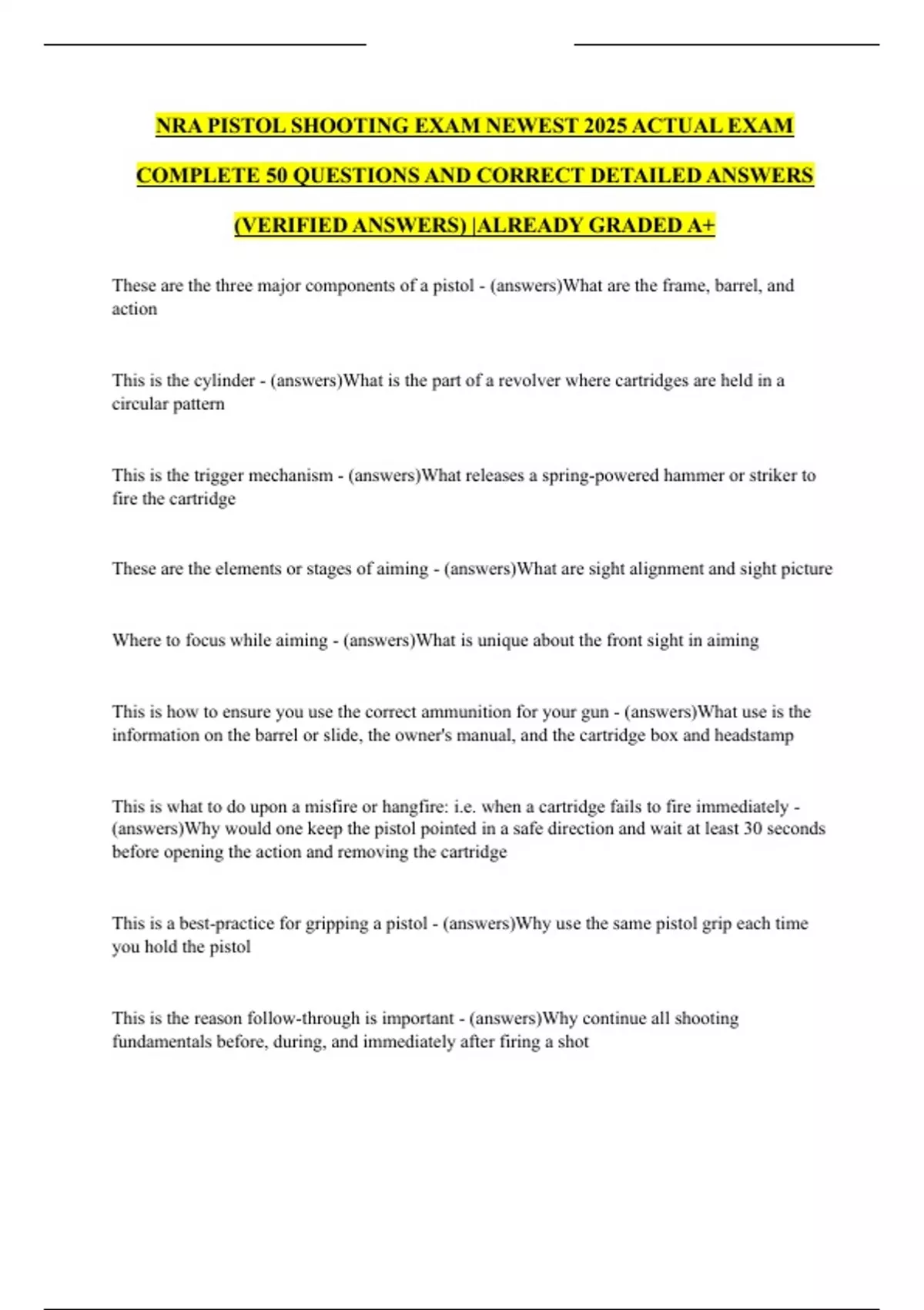 NRA PISTOL SHOOTING EXAM NEWEST 2025 ACTUAL EXAM COMPLETE 50 QUESTIONS AND CORRECT DETAILED ANSWERS (VERIFIED ANSWERS) |ALREADY GRADED A+
