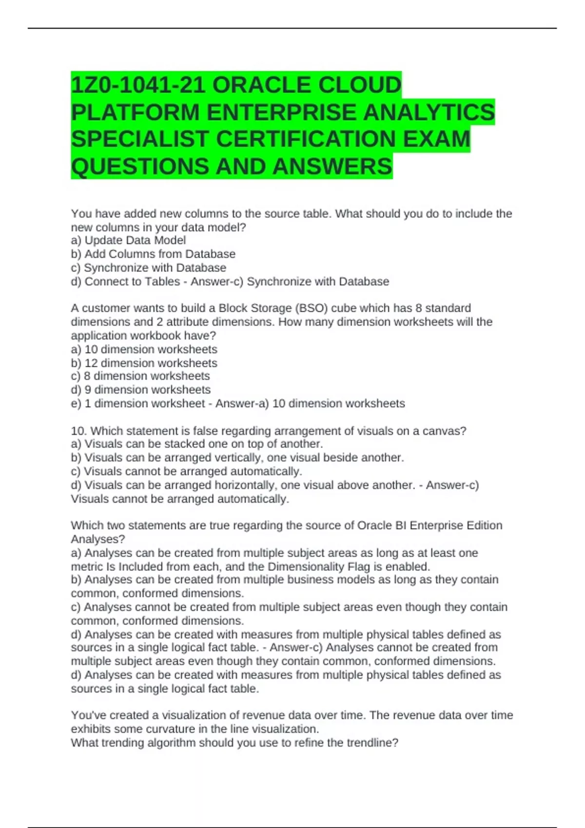 1Z0-1041-21 ORACLE CLOUD PLATFORM ENTERPRISE ANALYTICS SPECIALIST CERTIFICATION EXAM QUESTIONS AND ANSWERS