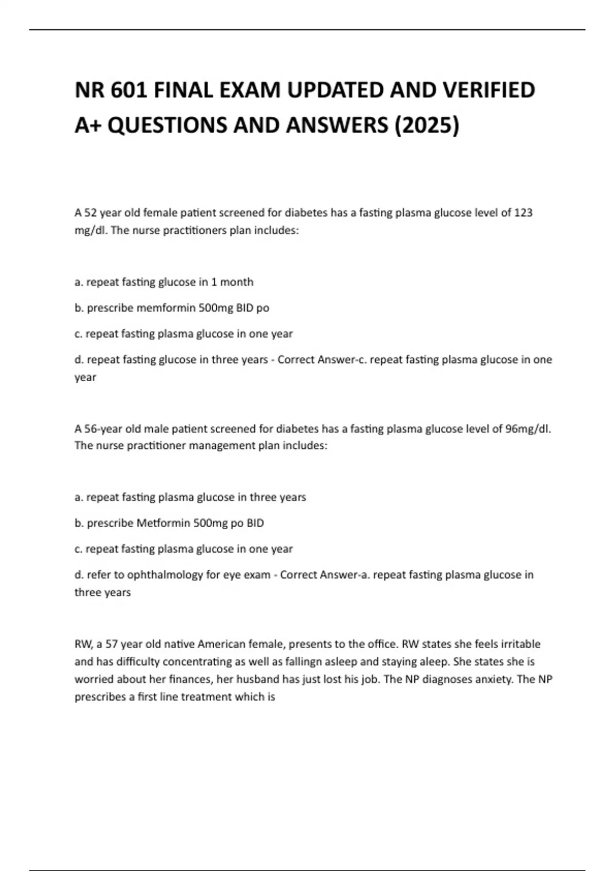 A 52 year old female patient screened for diabetes has a fasting plasma glucose level of 123 mg/dl. The nurse practitioners plan includes: a. repeat fasting glucose in 1 month b. prescribe memformin 500mg BID po c. repeat fasting plasma glucose in one year d. repeat fasting glucose in three years - Correct Answer-c. repeat fasting plasma glucose i