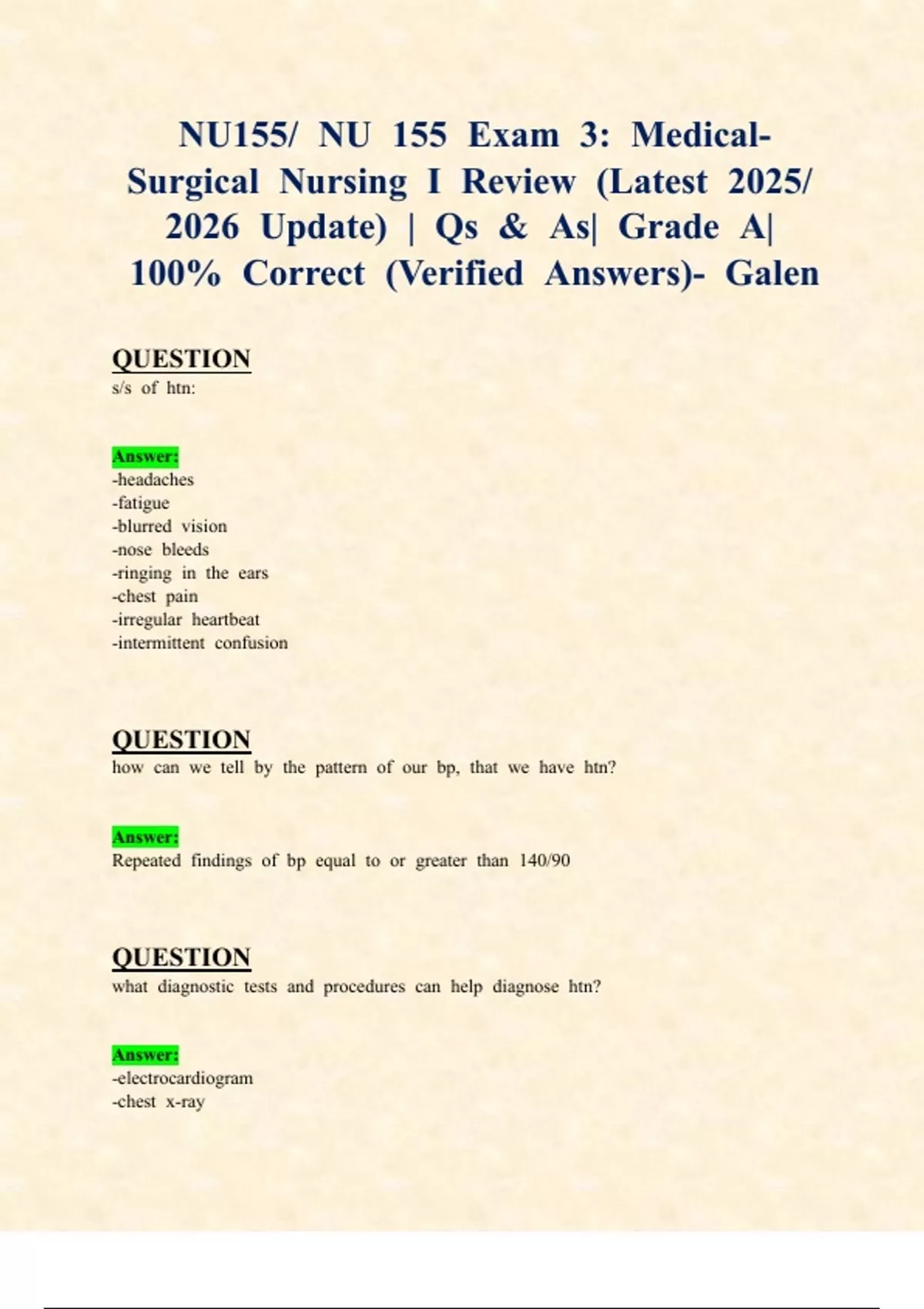 NU155/ NU 155 Exams 3 & 4: Medical-Surgical Nursing I (Latest 2025/ 2026 Updates STUDY BUNDLE WITH COMPLETE SOLUTIONS) | Qs & As| Grade A| 100% Correct (Verified Answers)- Galen