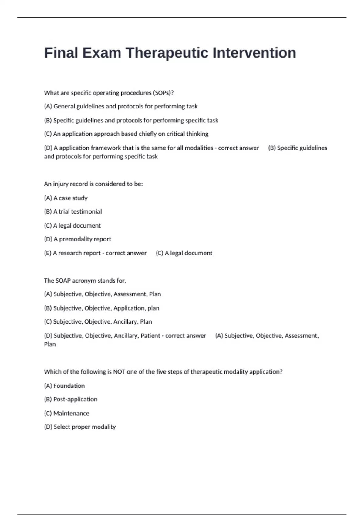 1 Exam (elaborations) Intro to Therapeutic Modalities - Exam 1 Questions And Answers Distinction Guaranteed 2 Exam (elaborations) Therapeutics 1 Exam 1 Advanced Questions And Correct Detailed Answers. 3 Exam (elaborations) Therapeutic Recreation final exam actual questions with 100% correct detailed answers. 4 Exam (elaborations) Therapeutic Exa