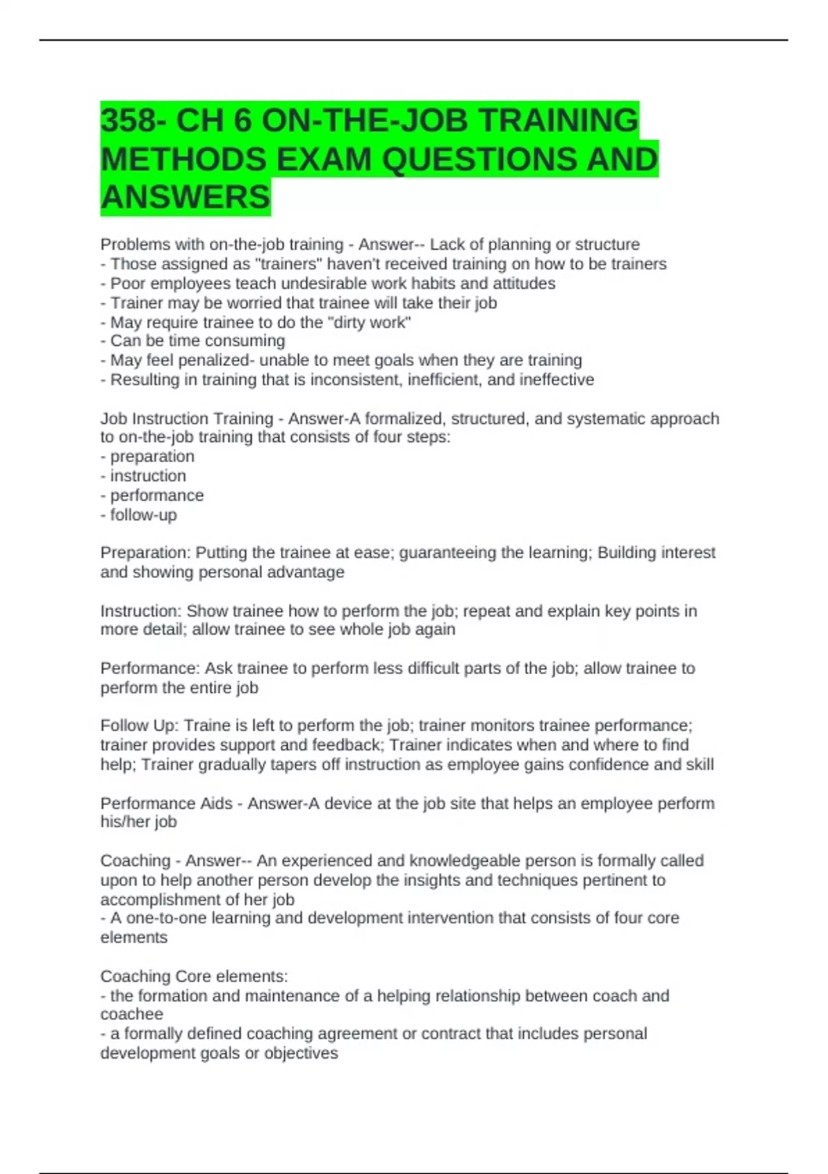 358- CH 6 ON-THE-JOB TRAINING METHODS EXAM QUESTIONS AND ANSWERS