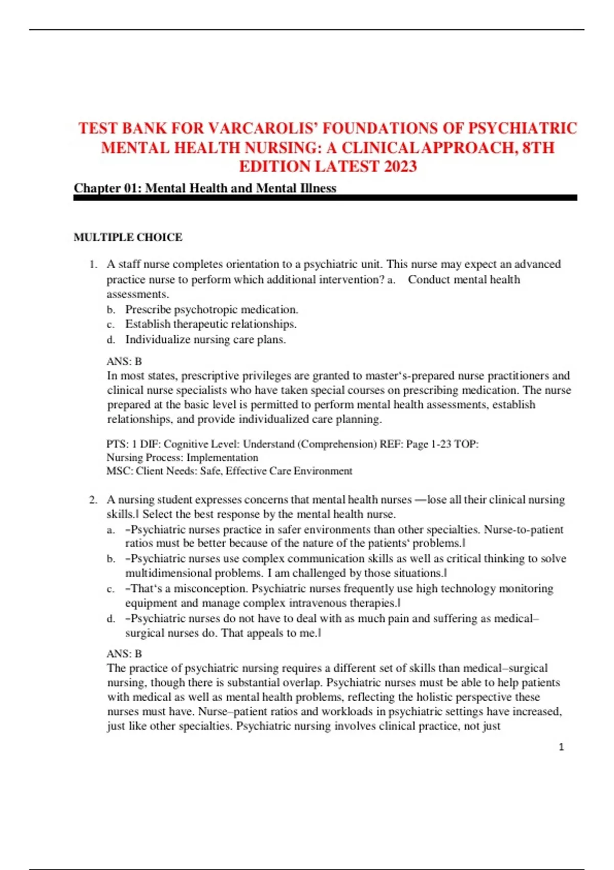TEST BANK FOR VARCAROLIS’ FOUNDATIONS OF PSYCHIATRIC MENTAL HEALTH NURSING: A CLINICAL APPROACH, 8TH EDITION LATEST 2023