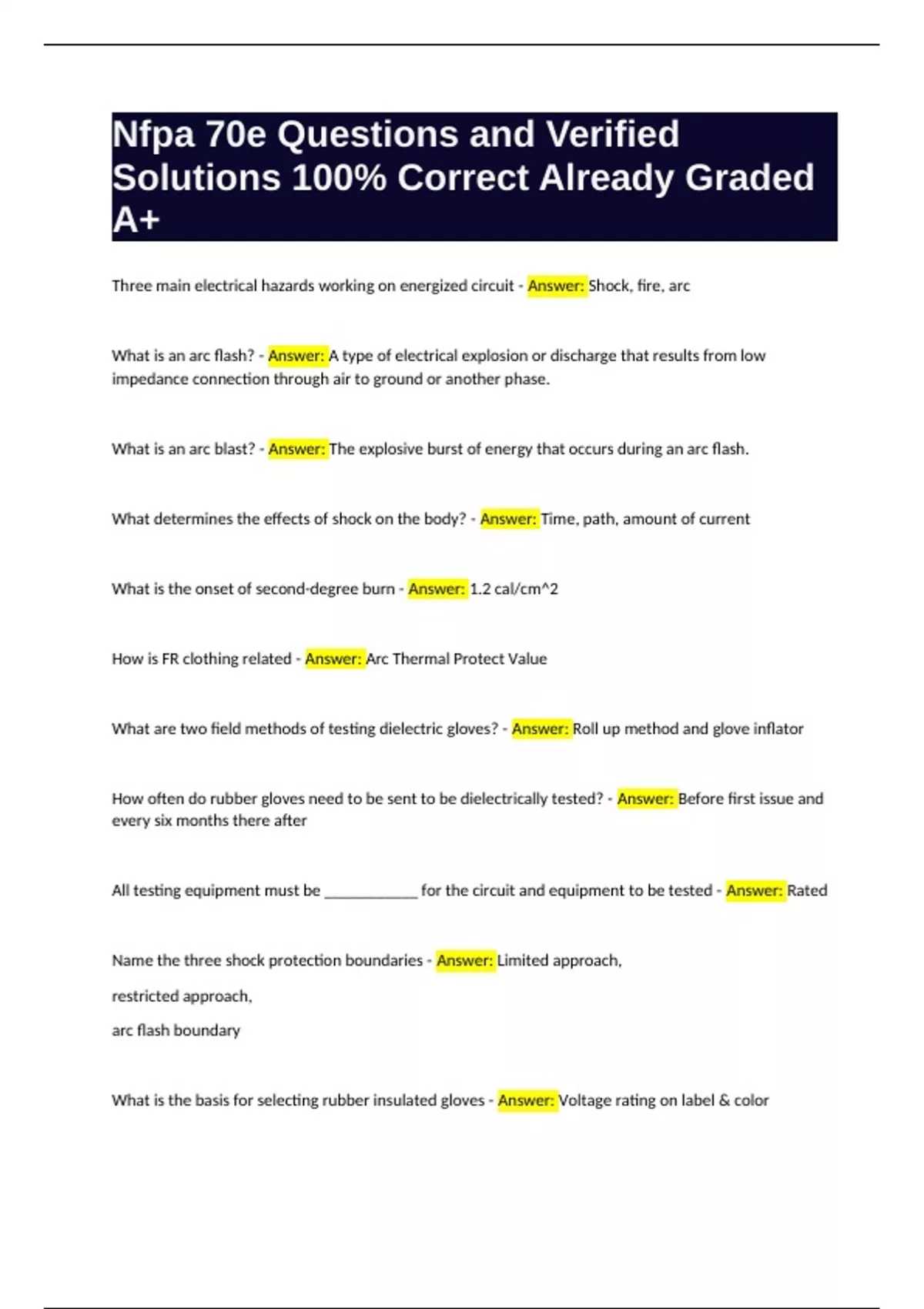 NFPA 70E Final Exam Questions and Verified Solutions 100% Correct Already Graded A Package Deal