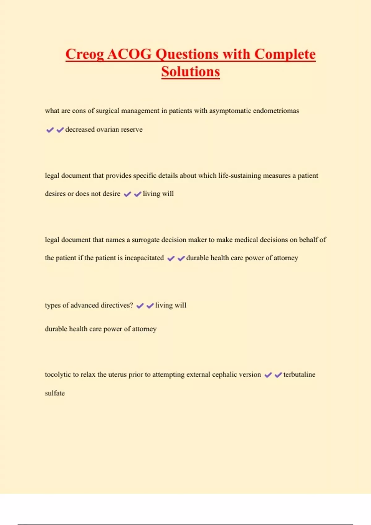 Creog ACOG Questions with Complete Solutions 2 Exam (elaborations) ACOG Questions Review With Complete Solutions 3 Exam (elaborations) ACOG Review 2024 Questions with Correct Answers 4 Exam (elaborations) ACOG Practice Bulletin 226 Questions with Complete Solutions 5 Exam (elaborations) Uterine Rupture ACOG Summary Questions with Complete Solut