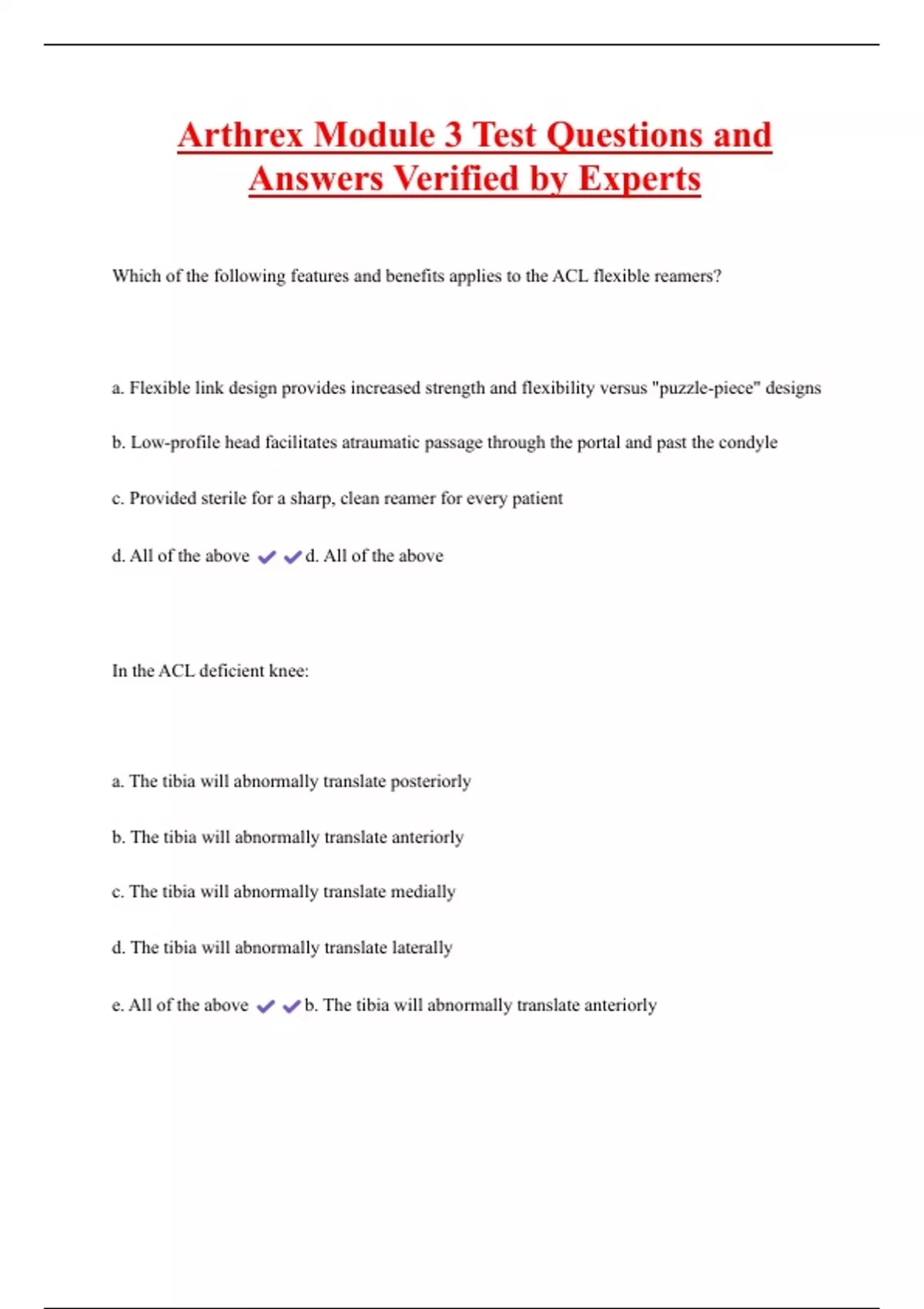 Arthrex Module 3 Test Questions and Answers Verified by Experts 2 Exam (elaborations) Arthrex Sports IOT Questions and Answers 100% Solved 3 Exam (elaborations) Arthrex Sports Module #4 Test Questions and Answers Verified by Experts 4 Exam (elaborations) Arthrex Sports Medicine Onboarding Module #3 Test Questions and Answers 100% Solved