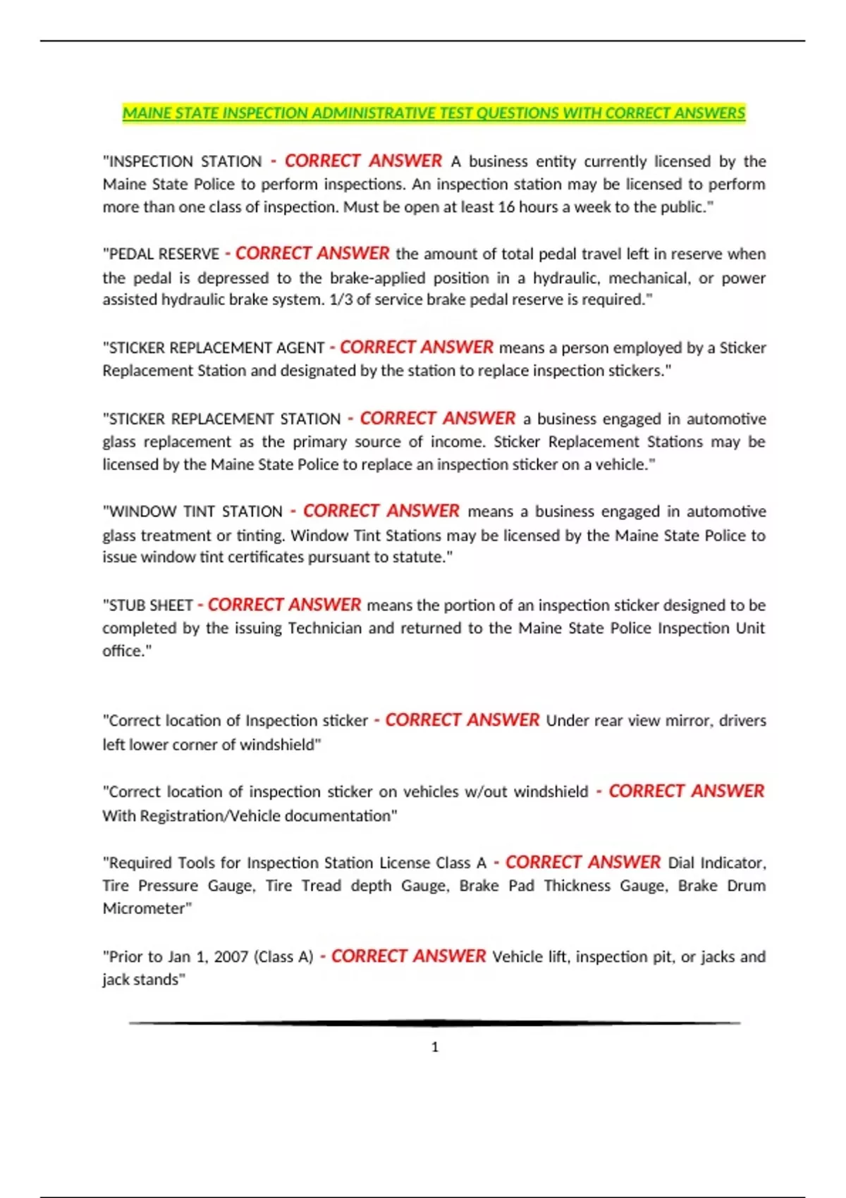 MAINE MOTOR VEHICLE INSPECTION LICENSE TEST ACTUAL EXAM SOLUTION GUIDE