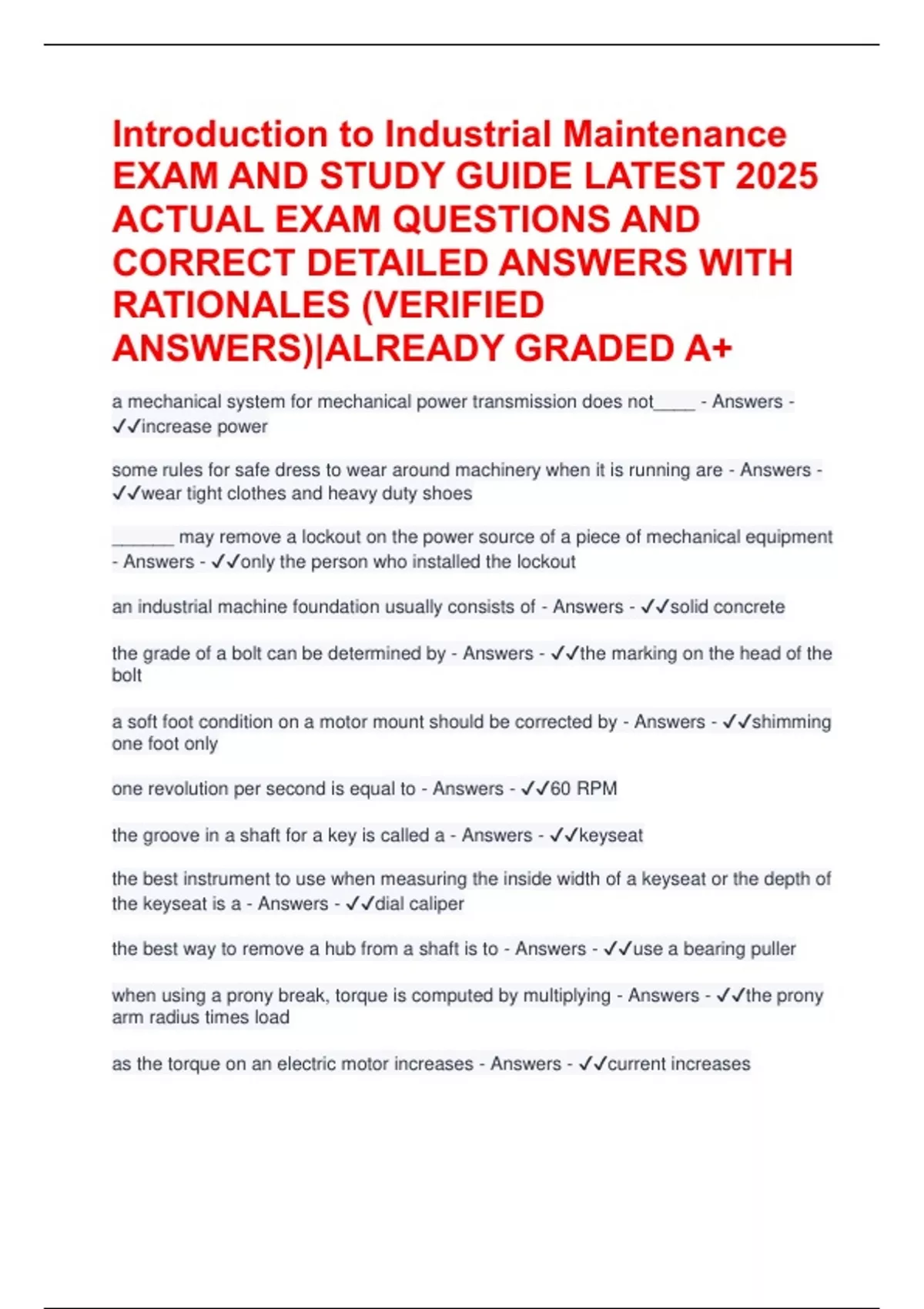 1 Exam (elaborations) Industrial maintenance Equipment EXAM NEWEST 2025 EXAM COMPLETE QUESTIONS AND CORRECT DETAILED ANSWERS (VERIFIED ANSWERS) |ALREADY GRADED A+||BRAND NEW!! 2 Exam (elaborations) Industrial Maintenance Mechatronics Exam Questions and Answers(A+ Solution guide) 3 Exam (elaborations) Industrial Maintenance Technician Questions &