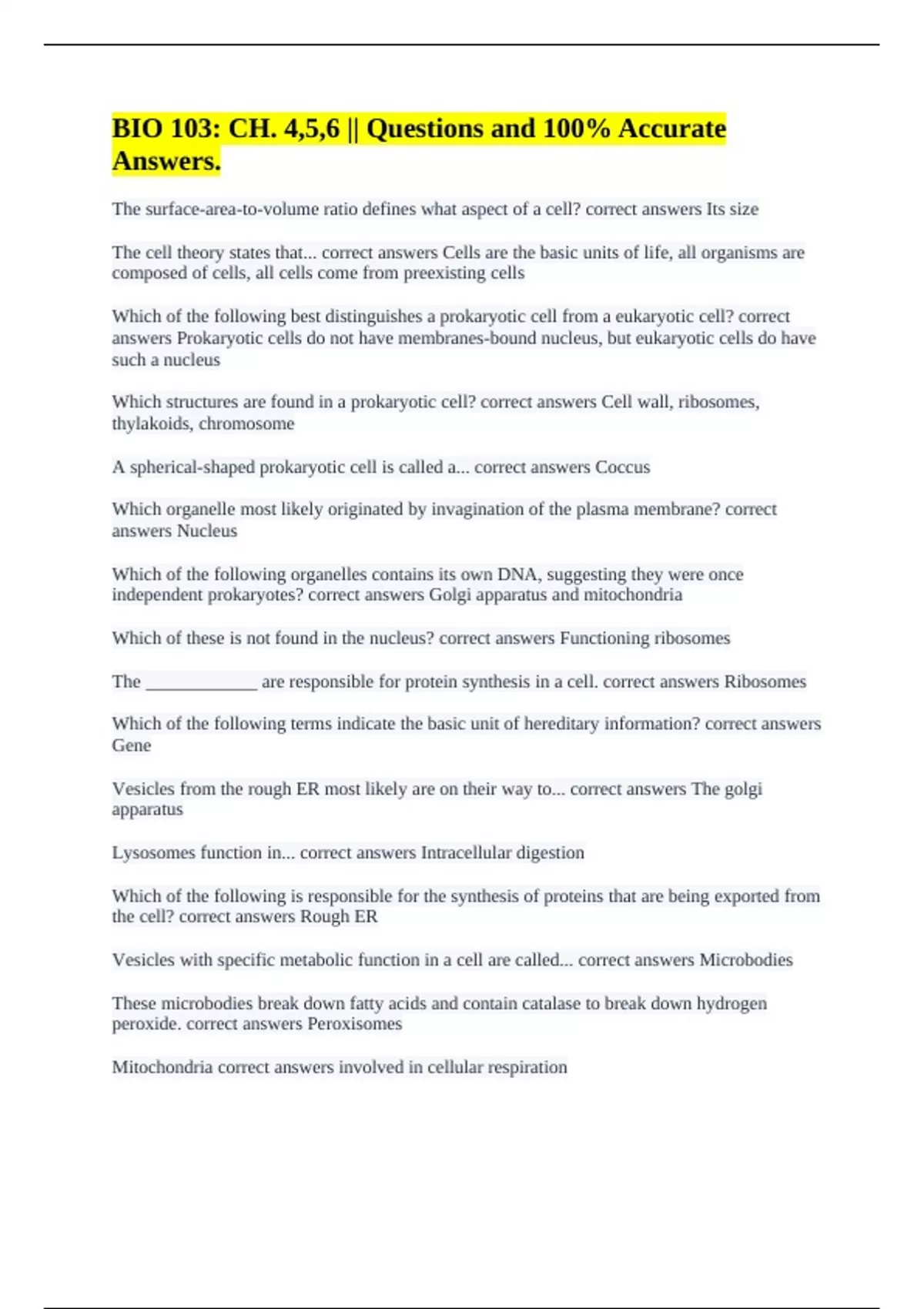 BIO 103: CH. 4,5,6 || Questions and 100% Accurate Answers. Biology 103 Photosynthesis || with Right Answers. Biology 103 Chapter 4 || with A+ Guaranteed Solutions. Biology 103 - Module 3 Exam Review || Already Passed. Biology Comprehensive Exam/Final Biology 103 || with Right Answers. Biology 103 Exam 1 || with 100% Verified Solutions. Biology 103