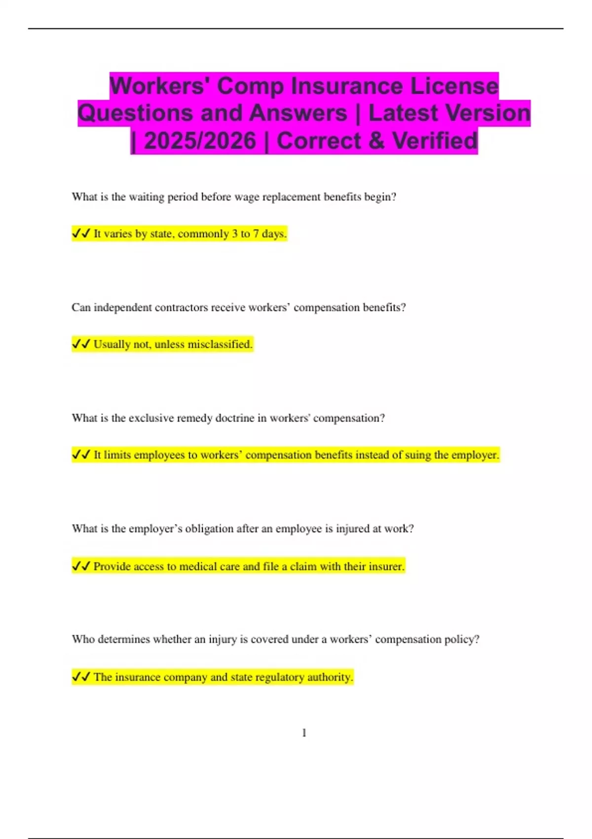 Workers Compensation Bundled Exams Questions and Answers Latest Versions (2025/2026) (Complete and Accurate)