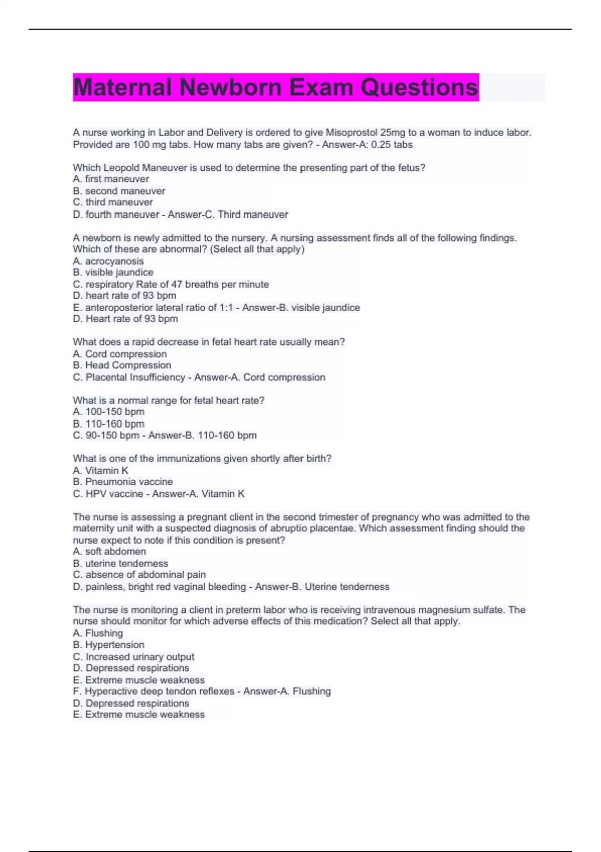 Maternal Newborn Exam Questions & Answers Well Explained