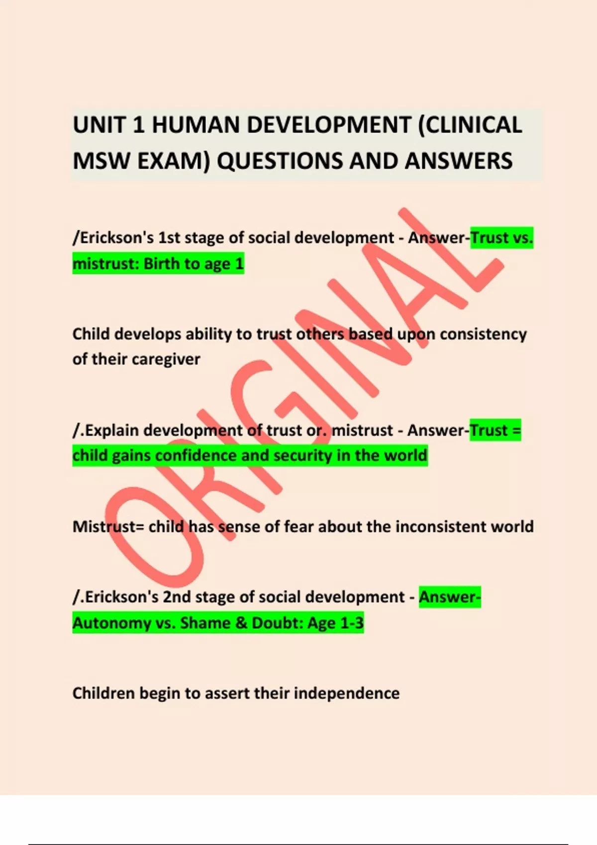 BUNDLE FOR UNIT 1 HUMAN DEVELOPMENT (CLINICAL MSW EXAM) QUESTIONS AND ANSWERS