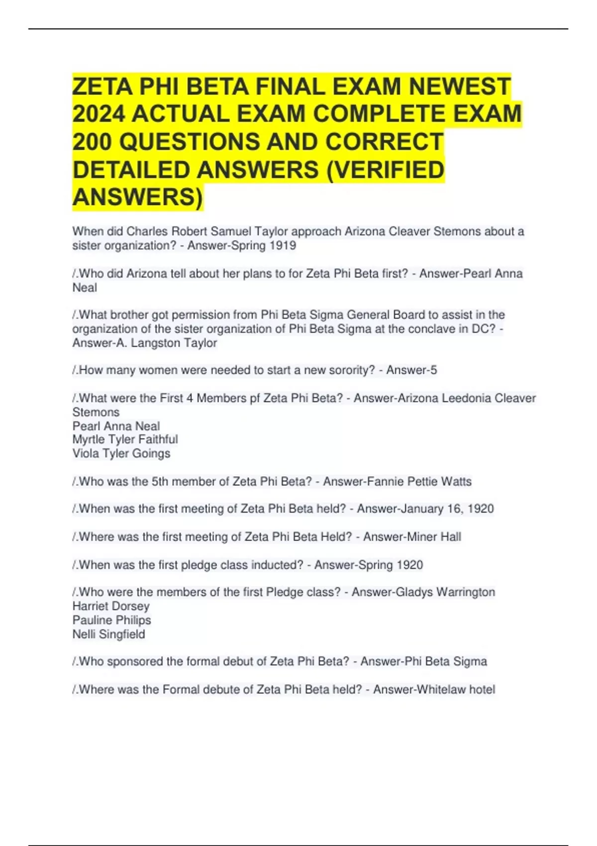 1 Exam (elaborations) Zeta Phi Beta Study Questions And Answers 2 Exam (elaborations) Zeta Phi Beta Study Questions and Answers Graded A 2025 3 Exam (elaborations) Zeta Phi Beta Final Exam (2024 / 2025 Update)210 Questions and Verified Answers | Certified | Grade A 4 Exam (elaborations) ZETA PHI BETA FINAL EXAM NEWEST 2024 ACTUAL EXAM COMPLETE E