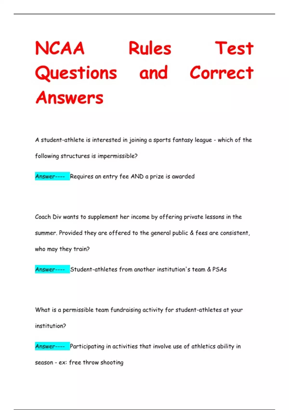 NCAA Rules Test Questions and Correct Answers