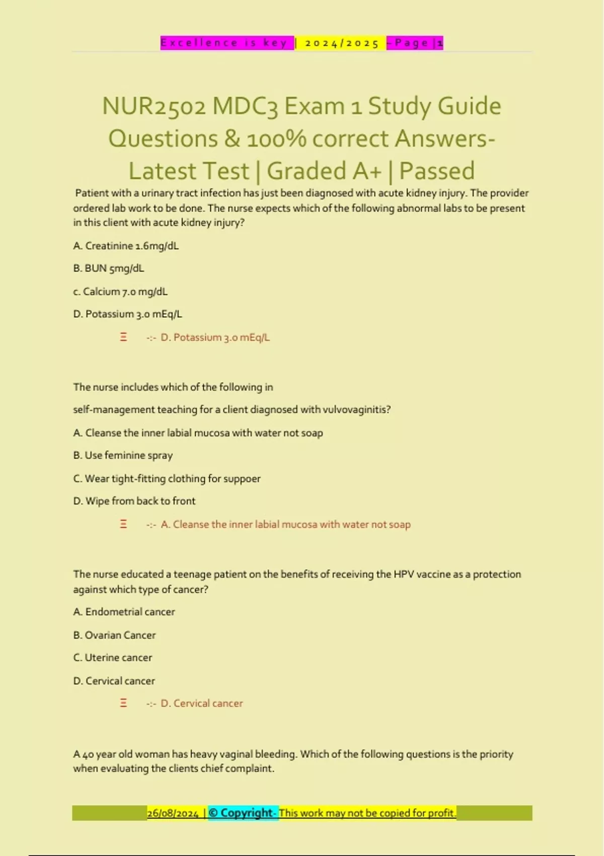 NUR2502 MDC3 Exam 1 Study Guide Questions & 100% correct AnswersLatest Test | Graded A+ | Passe
