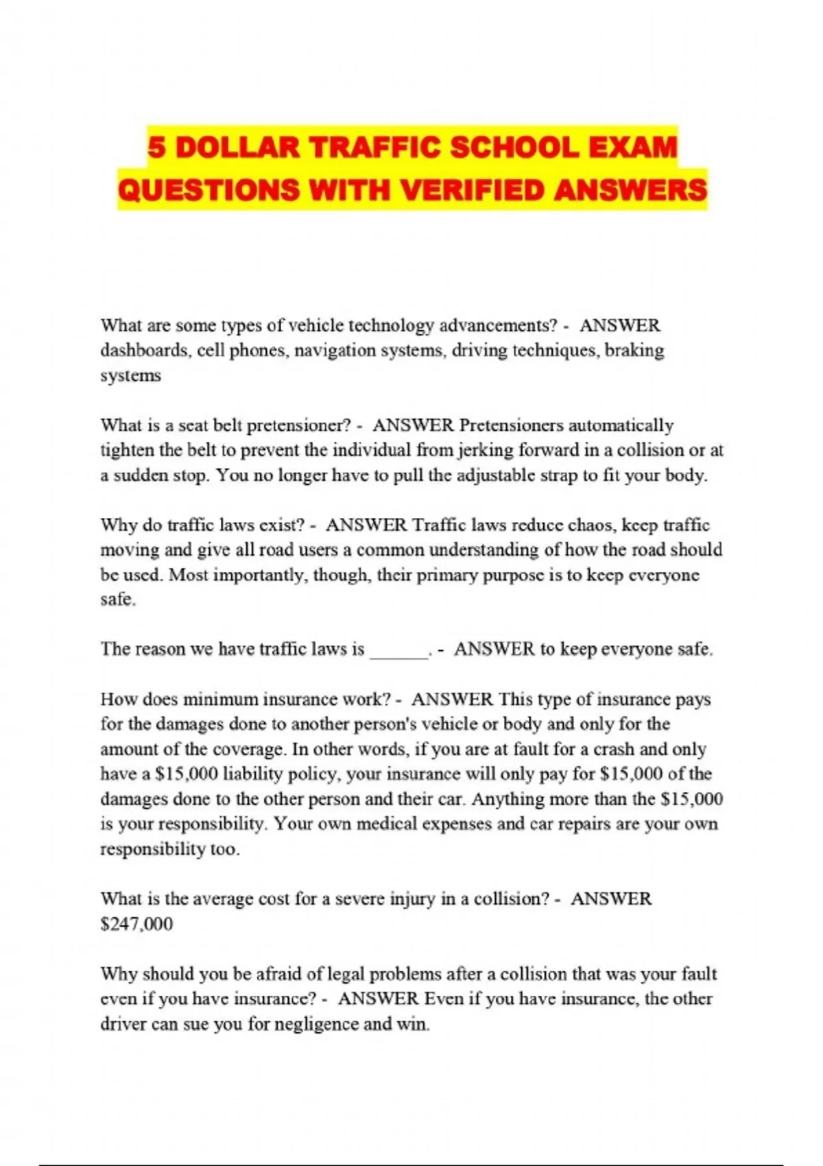 5 DOLLAR TRAFFIC SCHOOL TEST QUESTIONS AND ANSWERS