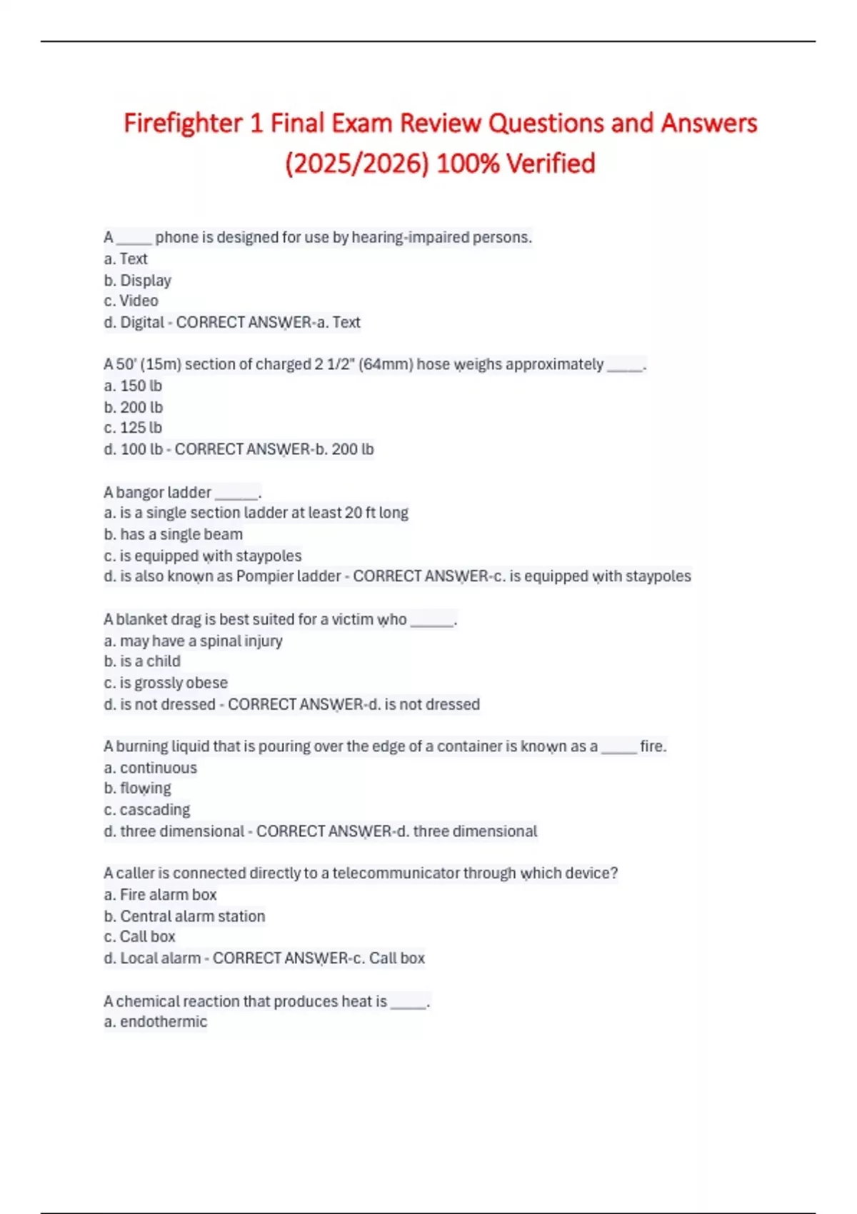 Fire Fighter 1 Study Guide Exam with Questions and Correct Answers (New 2025/2026) Basic Firefighter 1Written Exam Questions and Answers 2025/2026 Verified Fire Officer 1 - Multiple Choice Questions and Answers (Firefighter 1) 2025/2026 Verified Firefighter 1(HAZMATSECTION) Study Guide Questions and Answers (2025/2026) Fire Fighter 1 Final Exam Rev