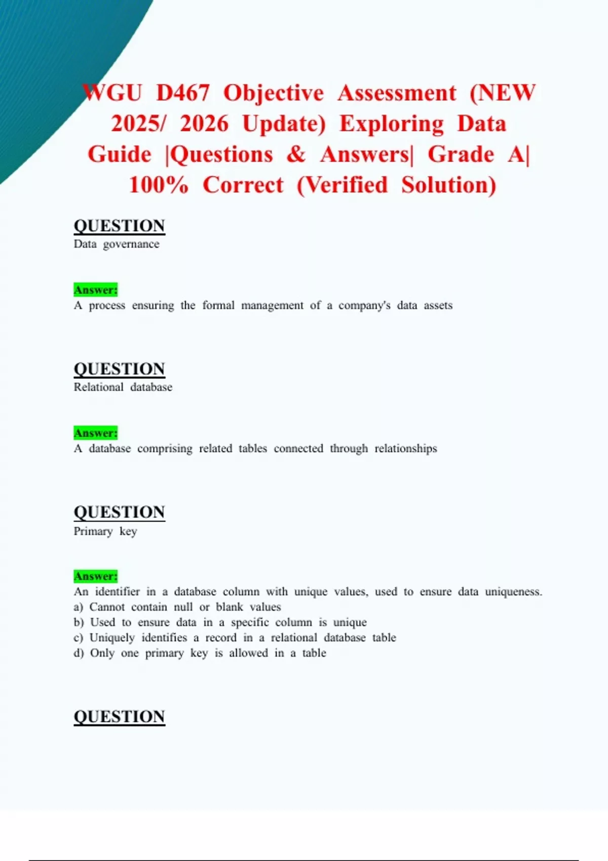 WGU D467 Objective Assessment (New 2025/ 2026 Update) Exploring Data Guide| Questions & Answers| Grade A| 100% Correct (Verified Solutions)