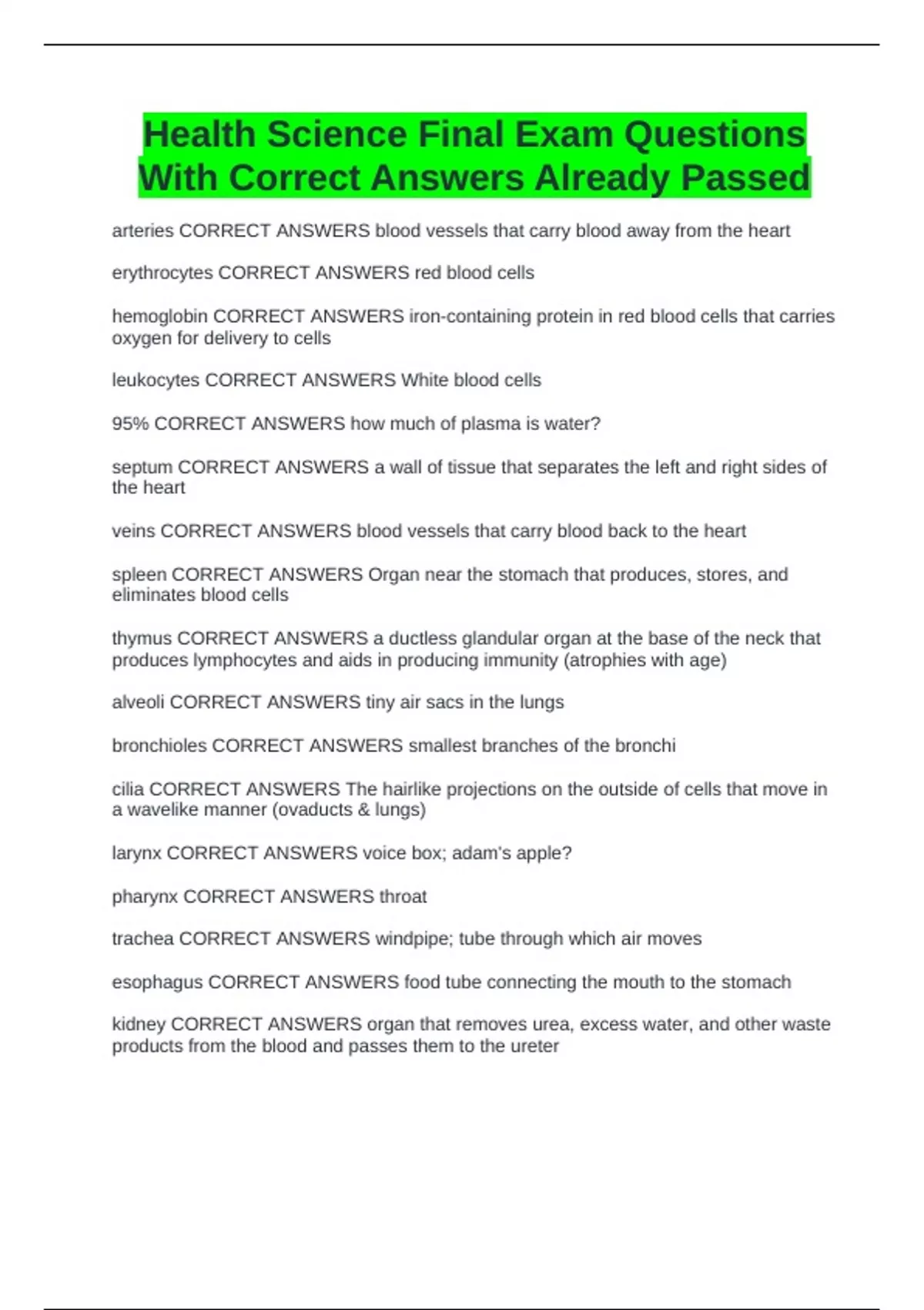 Health Science 1 Exam Study Guide With 100% Verified Answers 2025 Health Science 1 final exam review questions and answers latest update Principles of Health Science: Final Exam Review; Multiple Choice QuestionAnswered Correctly!!!