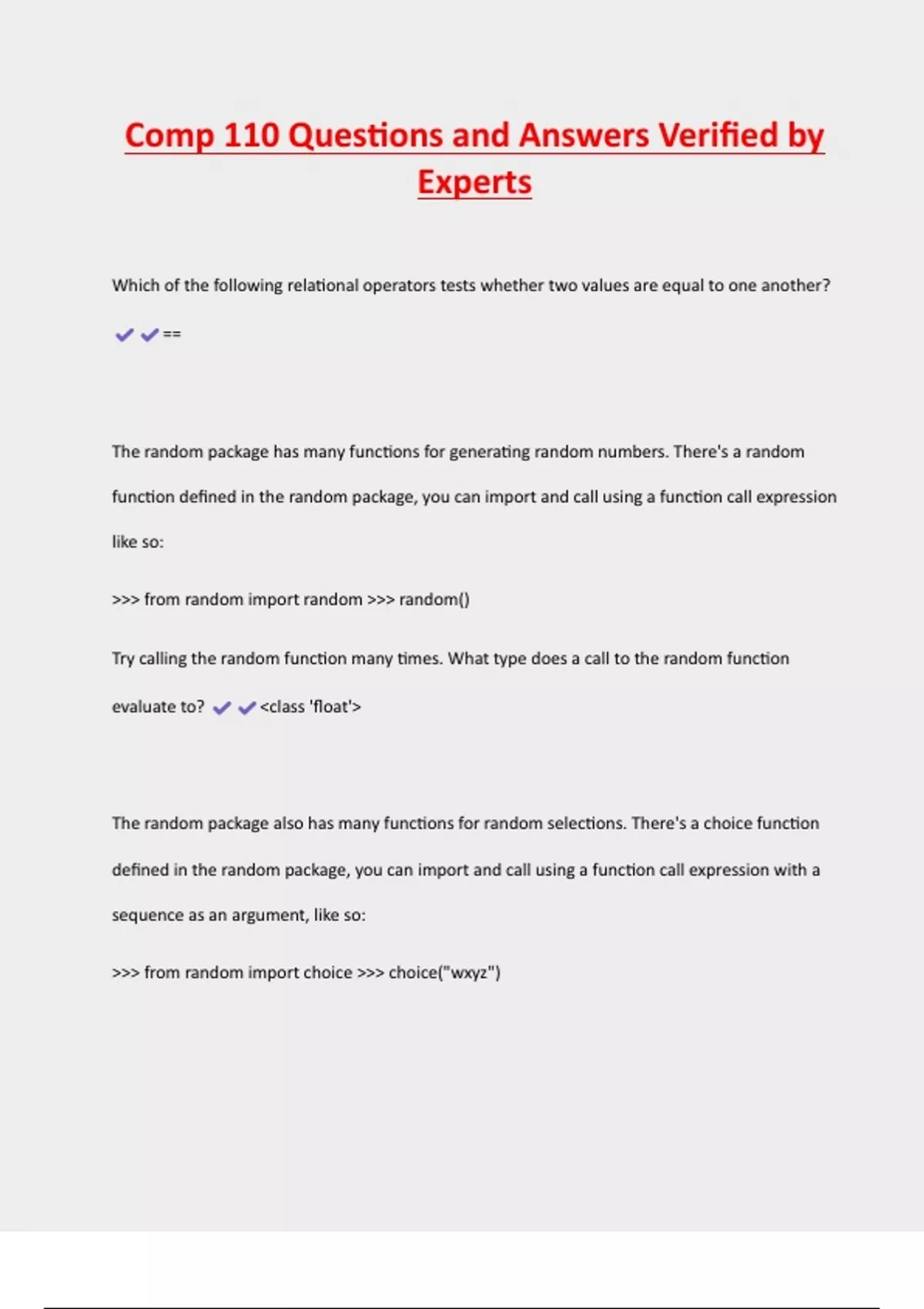 Comp 110 Questions and Answers Verified by Experts 2 Exam (elaborations) COMP 110 - Quiz 1 With Complete Solutions 3 Exam (elaborations) Comp 110 Final Exam Questions with Complete Solutions