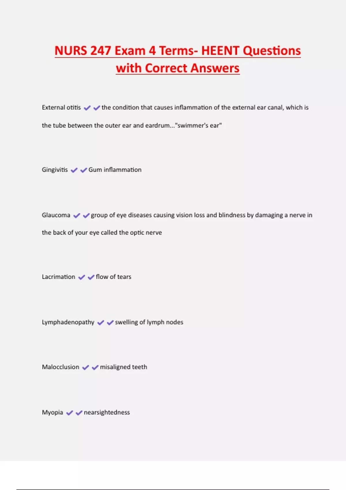 NURS 247 Exam 4 Terms- HEENT Questions with Correct Answers 2 Exam (elaborations) NURS 247: Exam 3 Questions with Correct Answers 3 Exam (elaborations) NURS 247 Exam 2 Questions and Answers 100% Solved 4 Exam (elaborations) NURS 247 Exam 1 Questions with Correct Answers 5 Exam (elaborations) NURS 247 Final Exam Questions with Correct Answers 6