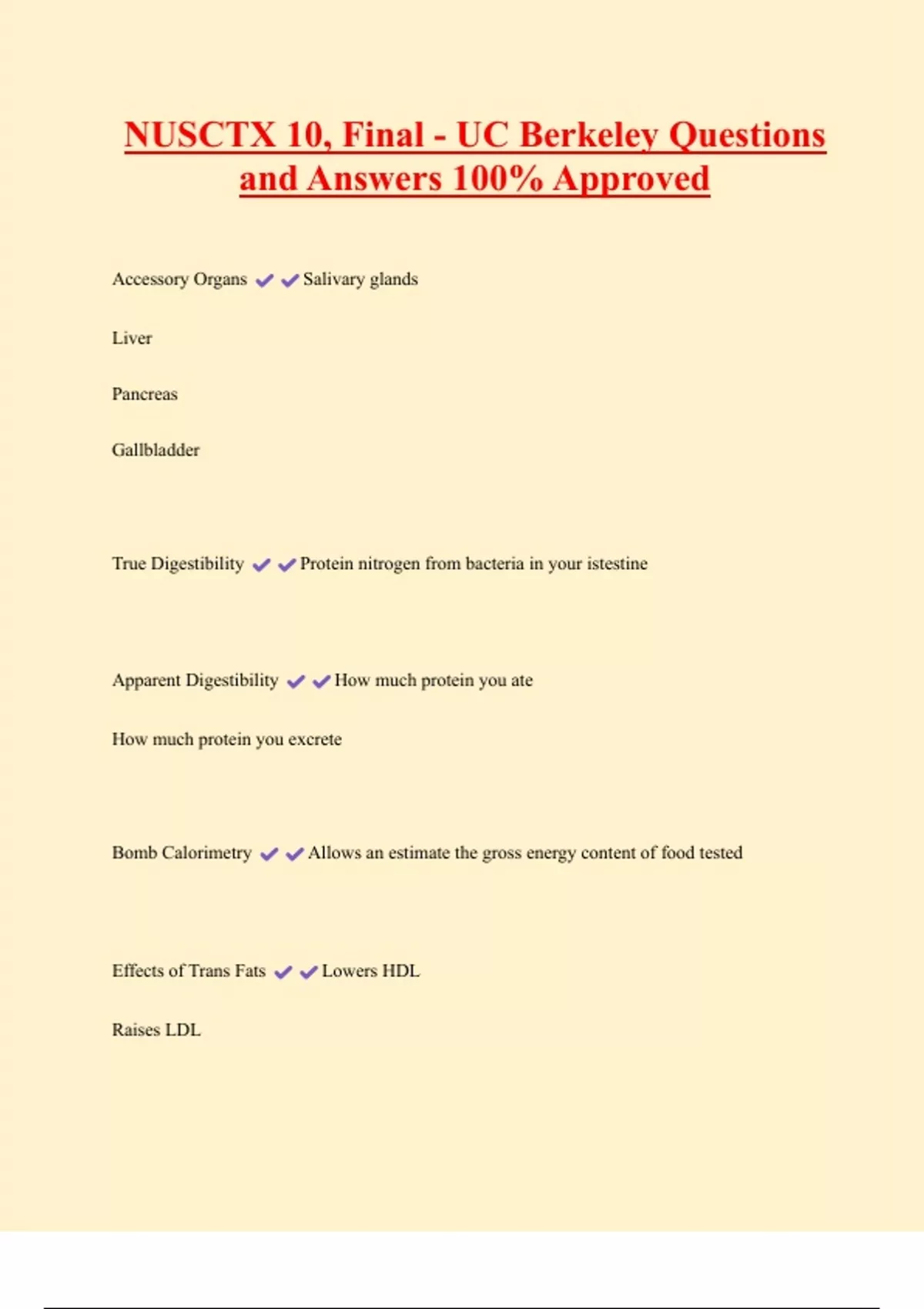 NUSCTX Questions with Correct Answers 2 Exam (elaborations) NUSCTX 104 Questions with Answers 1000% Solved 3 Exam (elaborations) NUSCTX 11, Final - UC Berkeley Questions and Answers 100% Solved 4 Exam (elaborations) NUSCTX 10 MIDTERM 1 Questions with Correct Answers 5 Exam (elaborations) NUSCTX 10, Final - UC Berkeley Questions and Answers 100%