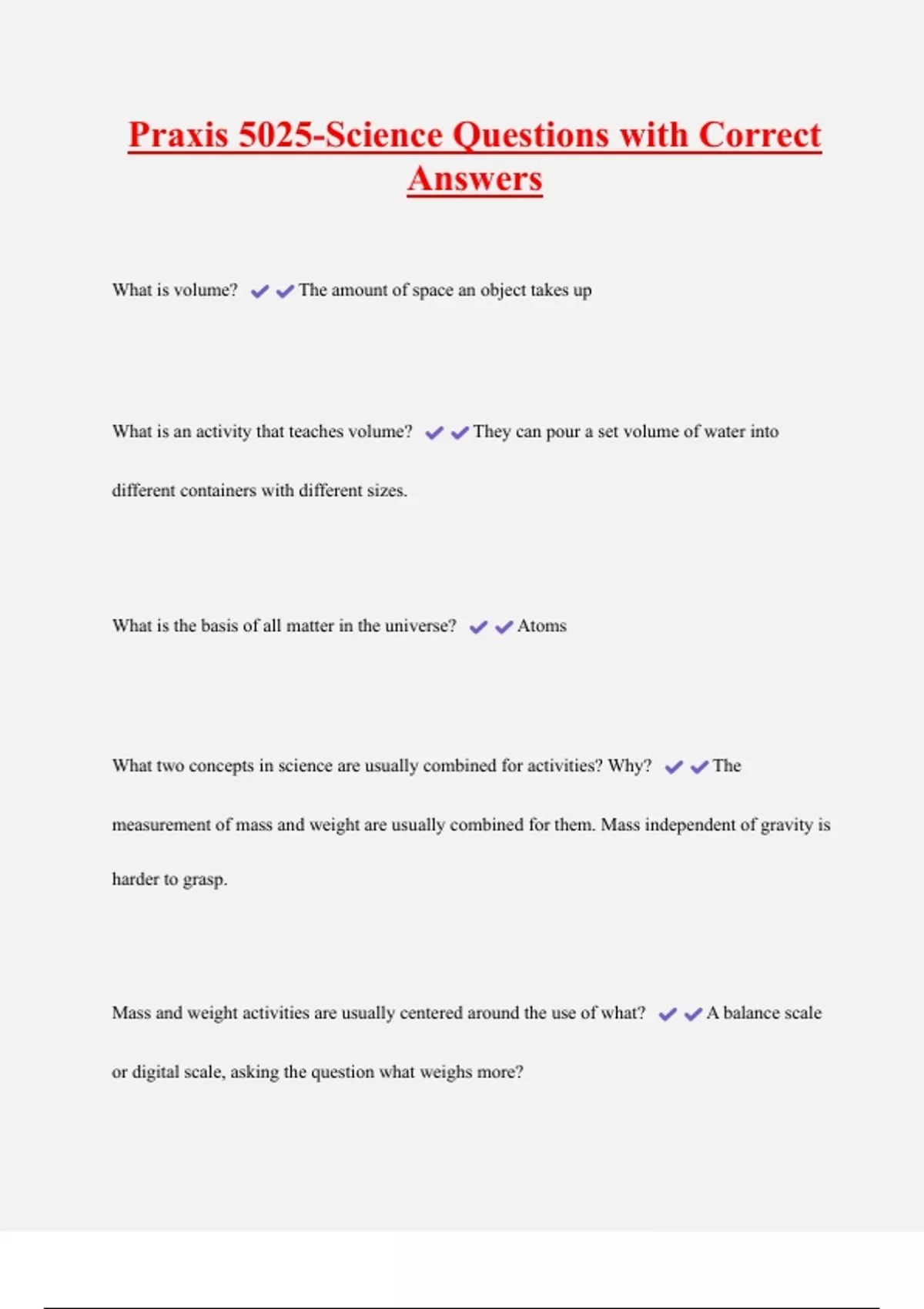 Praxis 5025-Science Questions with Correct Answers 2 Exam (elaborations) Praxis (5025) Exam Questions with Complete Solutions 3 Exam (elaborations) Early Childhood Praxis P-3 (5025) Questions and Answers Graded A+ 4 Exam (elaborations) Praxis 5025: Early Childhood Education Questions and Answers 100% Solved 5 Exam (elaborations) Praxis 5025 Sci