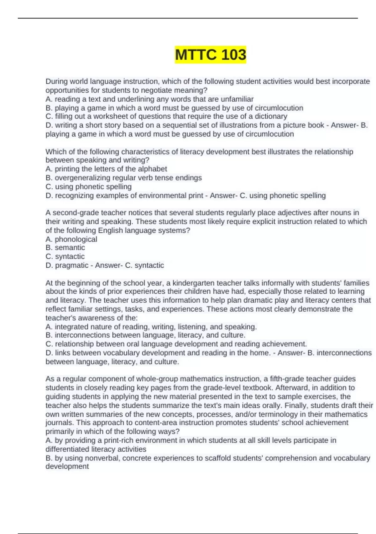 MTTC 103 EXAM QUESTIONS AND ANSWERS