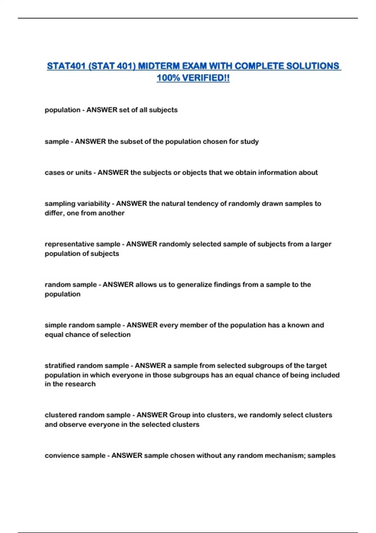STAT401 (STAT 401) MIDTERM EXAM WITH COMPLETE SOLUTIONS 100% VERIFIED!!