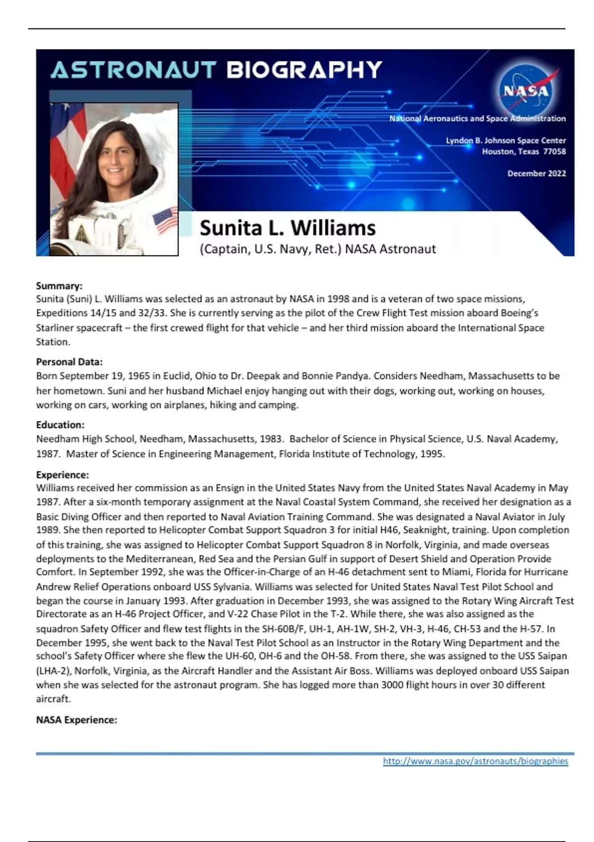 ATO2 Navy Advancement exam questions with 100% correct verified detailed answers latest update 2025 BEST NAVY ADVANCED RECRUITER STUDY COMPILATION latest update 2025 Astronaut Biography Sunita L. Williams (Captain, U.S. Navy, Ret.) NASA Astronaut