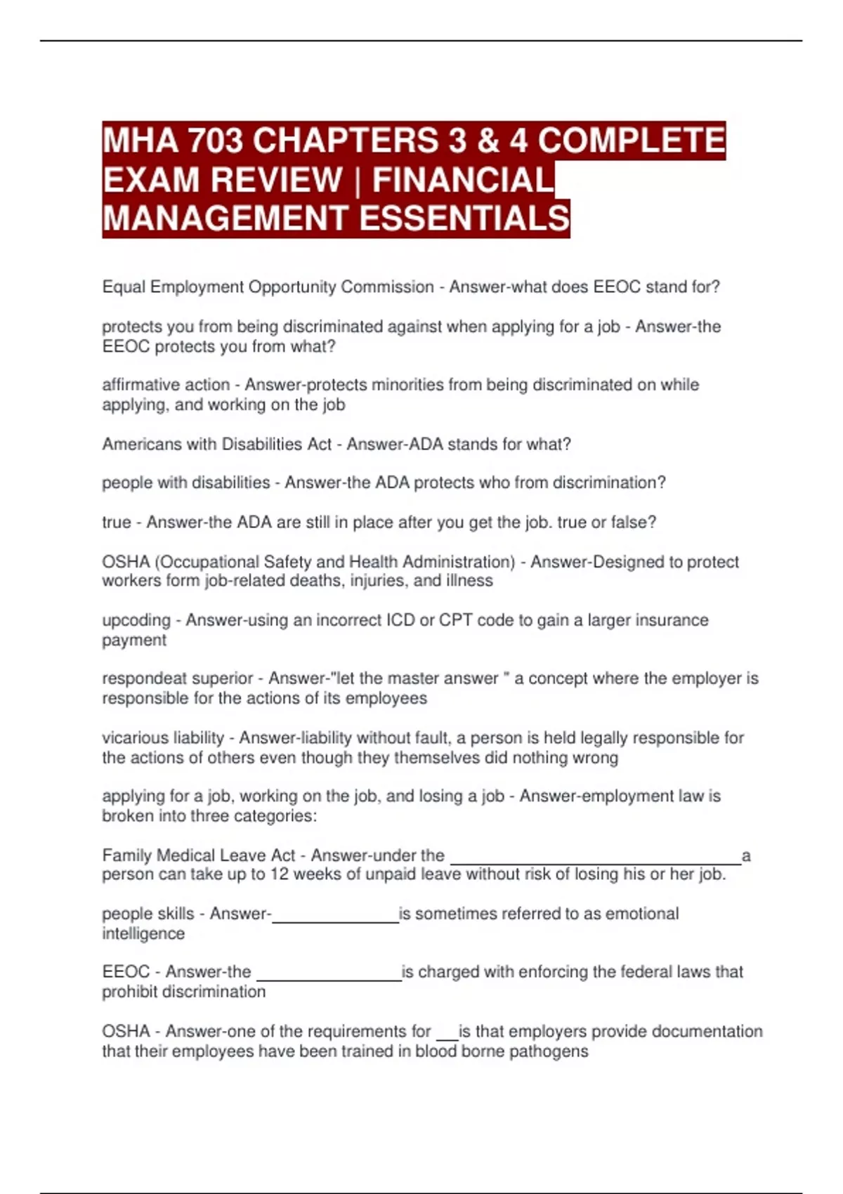MHA 703 CHAPTERS 3 & 4 COMPLETE EXAM REVIEW - FINANCIAL MANAGEMENT ESSENTIALS 2 Exam (elaborations) MHA 703 EXAM - LATEST QUESTIONS AND VERIFIED (2025 EDITION) 3 Exam (elaborations) MHA 703 MODULE 1 QUIZ REVIEW - REAL EXAM QUESTIONS WITH EXPERT SOLUTIONS 4 Exam (elaborations) MHA 703 MODULE 1 QUIZ REVIEW EXAM WITH COMPLETE SOLUTIONS 5 Exam (ela