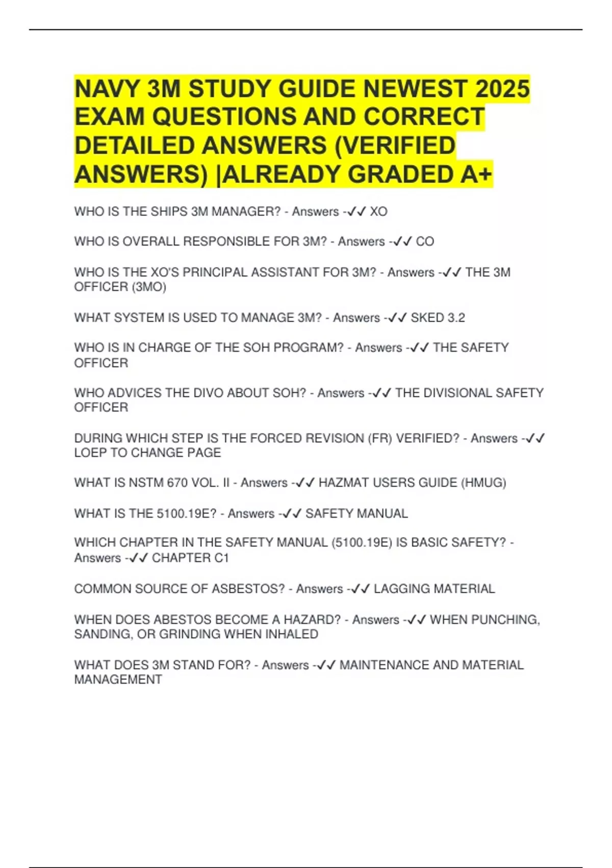 Bundle For Navy 3M Exam Questions 100% Correct A+ Solution Guide New Update (Verified Answers)