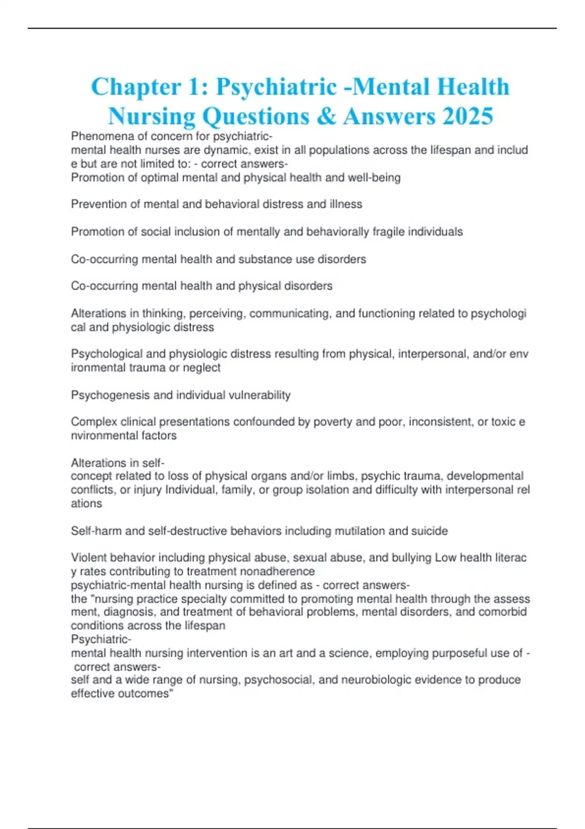 Chapter 1: Psychiatric -Mental Health Nursing Questions & Answers 2025