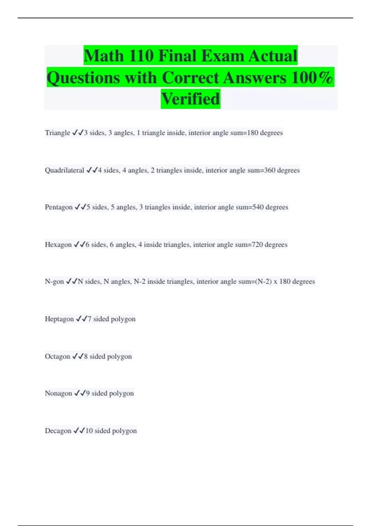 math 110 test 4 | LATEST UPDATE | COMPREHENSIVE QUESTIONS WITH 100% RATED ANSWERS | GUARANTEED TO PASS 5 Exam (elaborations) Math 110 Final Exam | LATEST UPDATED | COMPREHENSIVE QUESTIONS WITH 100% RATED ANSWERS | GUARANTEED TO PASS 6 Exam (elaborations) Math 110 Test 3 LATEST UPDATE| COMPREHENSIVE QUESTIONS WITH 10