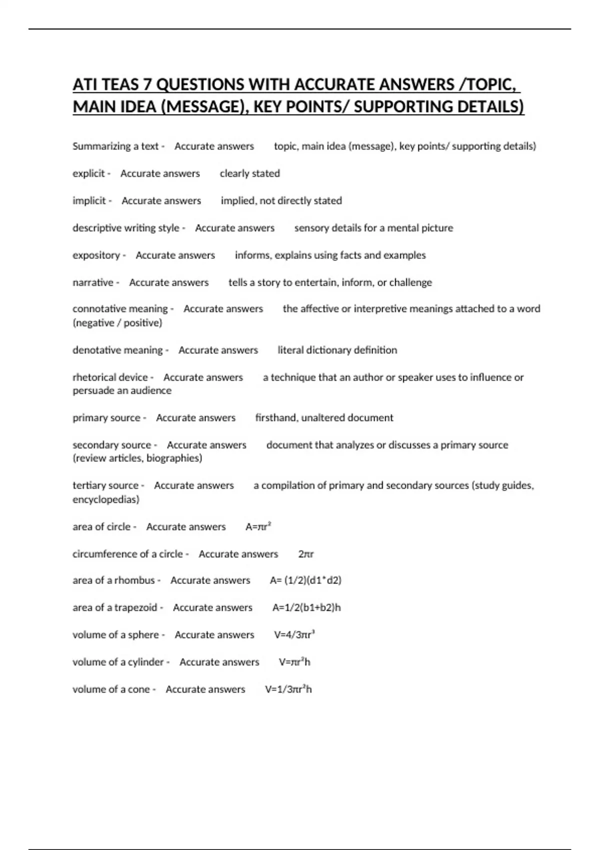 ATI TEAS 7 QUESTIONS WITH ACCURATE ANSWERS /TOPIC, MAIN IDEA (MESSAGE), KEY POINTS/ SUPPORTING DETAILS) ATI TEAS 7 – ANATOMY QUESTIONS WITH ACCURATE ANSWERS ATI TEAS 7-PRATICE QUESTIONS WITH ACCURATE ANSWERS ATI TEAS 7 ENGLISH QUESTIONS WITH ACCURATE ANSWERS ATI TEAS 7 MATH QUESTIONS WITH ACCURATE ANSWERS ATI- TEAS 7 QUESTIONS/DEFINATIONS OF TERMS