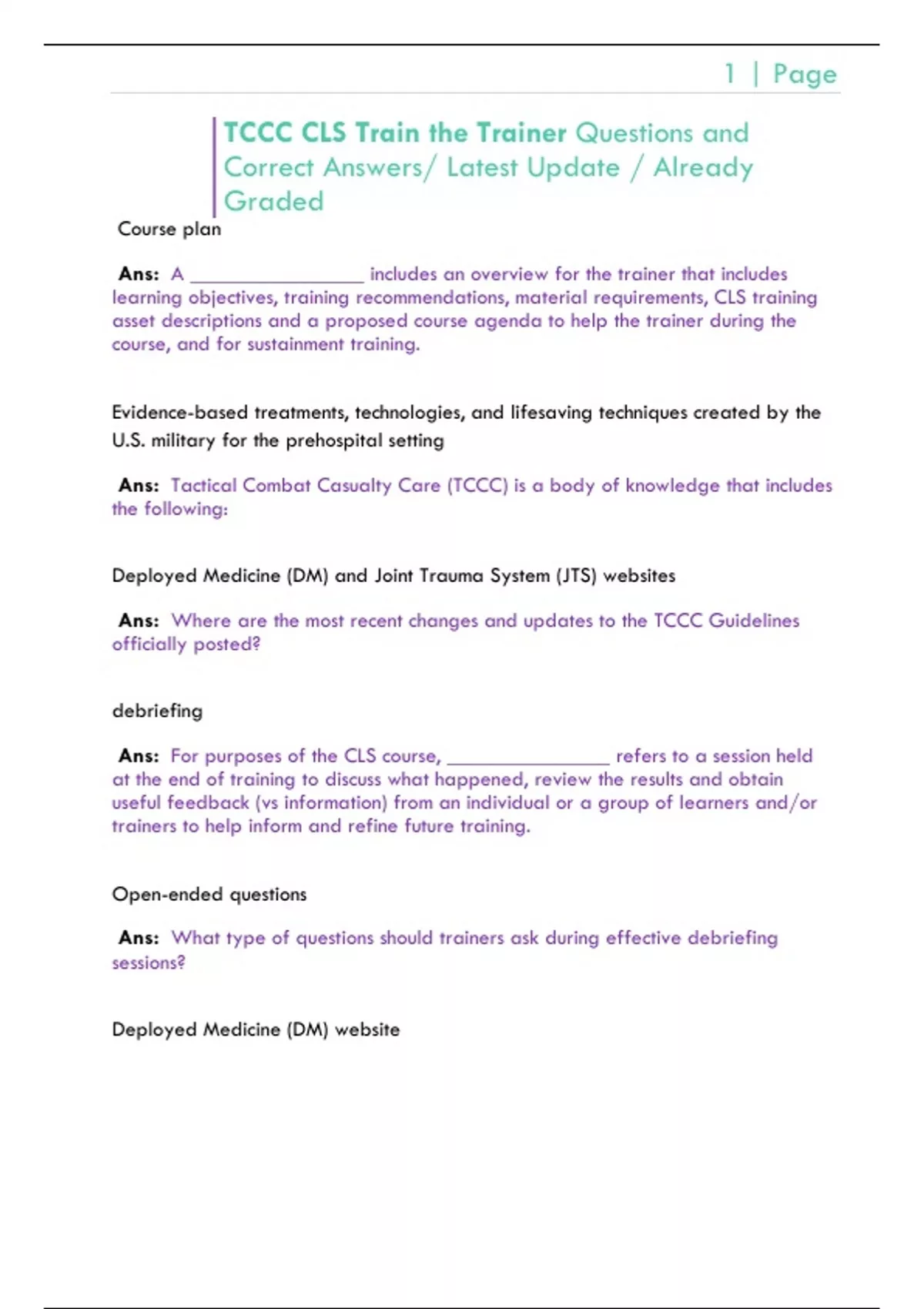 TCCC CLS Questions and Correct Answers/ Latest Update / Already Graded