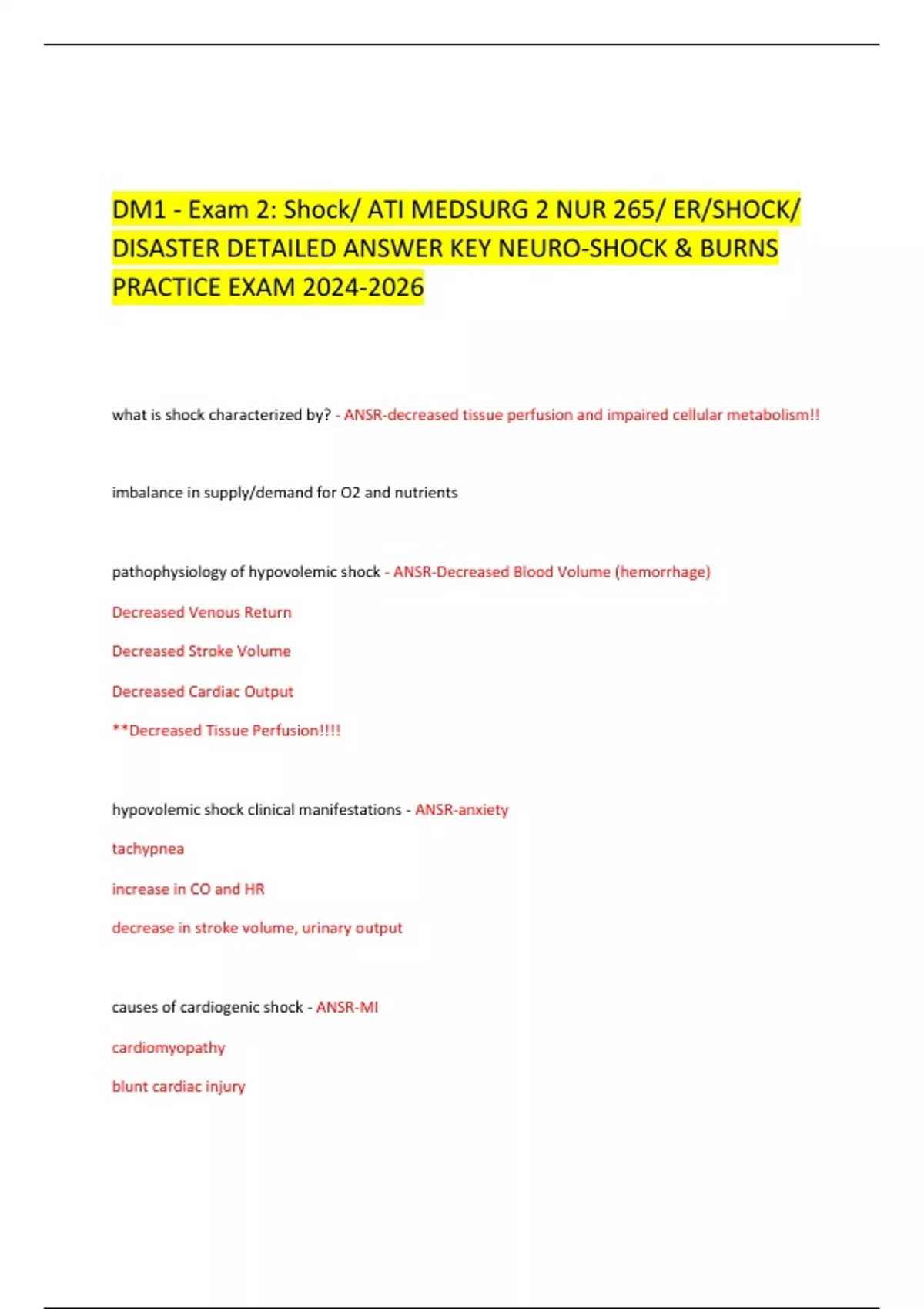 DM1 - Exam 2: Shock/ ATI MEDSURG 2 NUR 265/ ER/SHOCK/ DISASTER DETAILED ANSWER KEY NEURO-SHOCK & BURNS PRACTICE EXAM