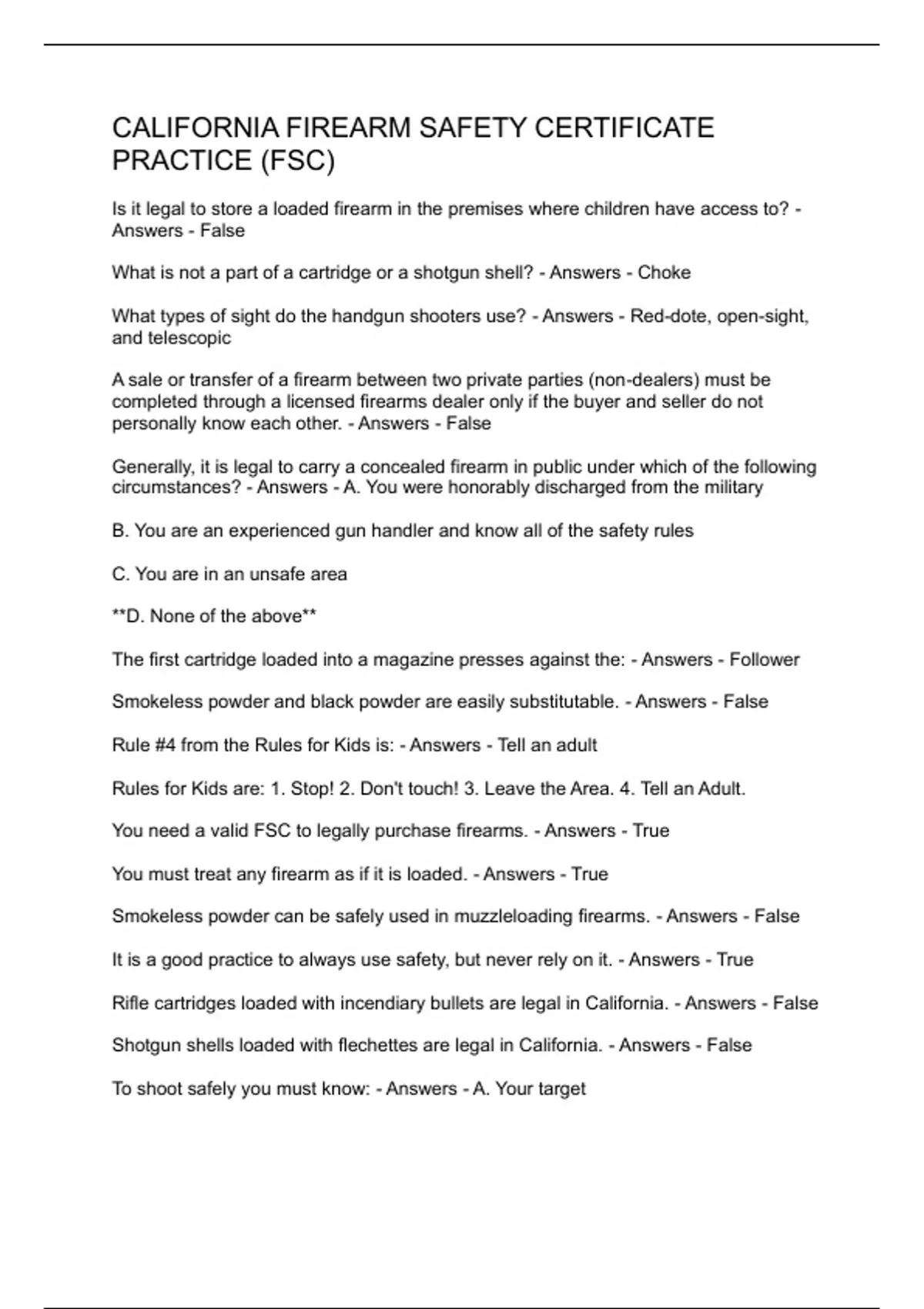 Exam (elaborations) CALIFORNIA FIREARMS SAFETY STUDY GUIDE 2 Exam (elaborations) CALIFORNIA FIREARMS SAFETY CERTIFICATE Q&A 2025 3 Exam (elaborations) CA FIREARMS SAFETY TEST QUESTIONS & ANSWERS 4 Exam (elaborations) FSC CALIFORNIA FIREARMS PRACTICE TEST 5 Exam (elaborations) CALIFORNIA FIREARM SAFETY CERTIFICATE PRACTICE (FSC) 6 Exam (elabora