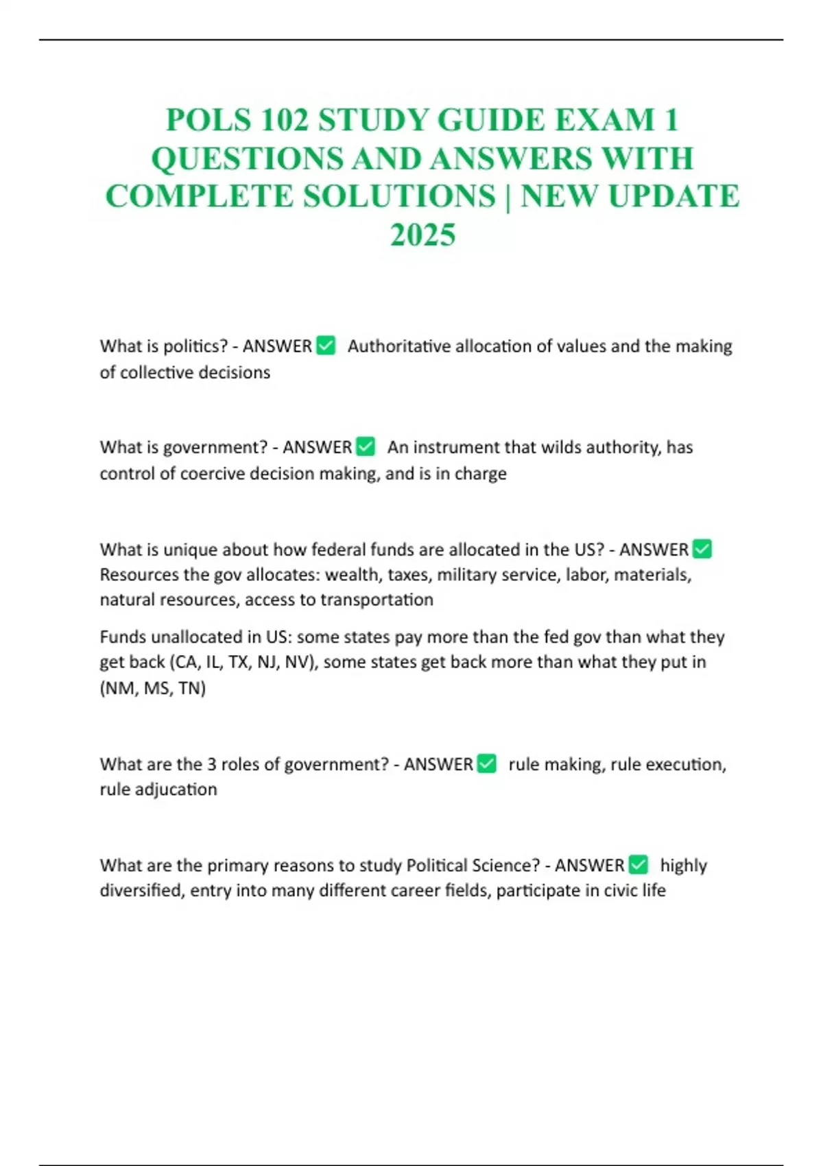 POLS 102 STUDY GUIDE EXAM 1 QUESTIONS AND ANSWERS WITH COMPLETE SOLUTIONS | NEW UPDATE 2025