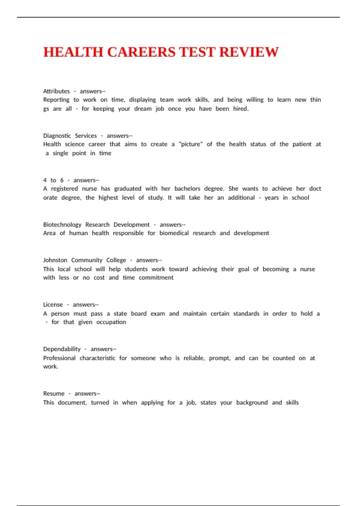 HEALTH CARE CAREERS TEST