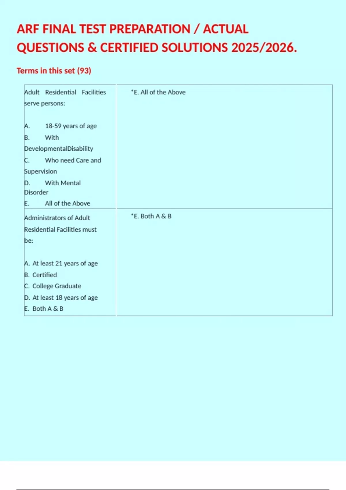 1 Exam (elaborations) ARF FINAL TEST PREPARATION / ACTUAL QUESTIONS & CERTIFIED SOLUTIONS 2025/2026. 2 Exam (elaborations) ARF Administrator Certification. / Actual Complete Accurate Quizzes with Verified Answers / 3 Exam (elaborations) ARF Title 22 Study Guide 1 (Preparation for Adult Residential Facility Administrator Test - Californi