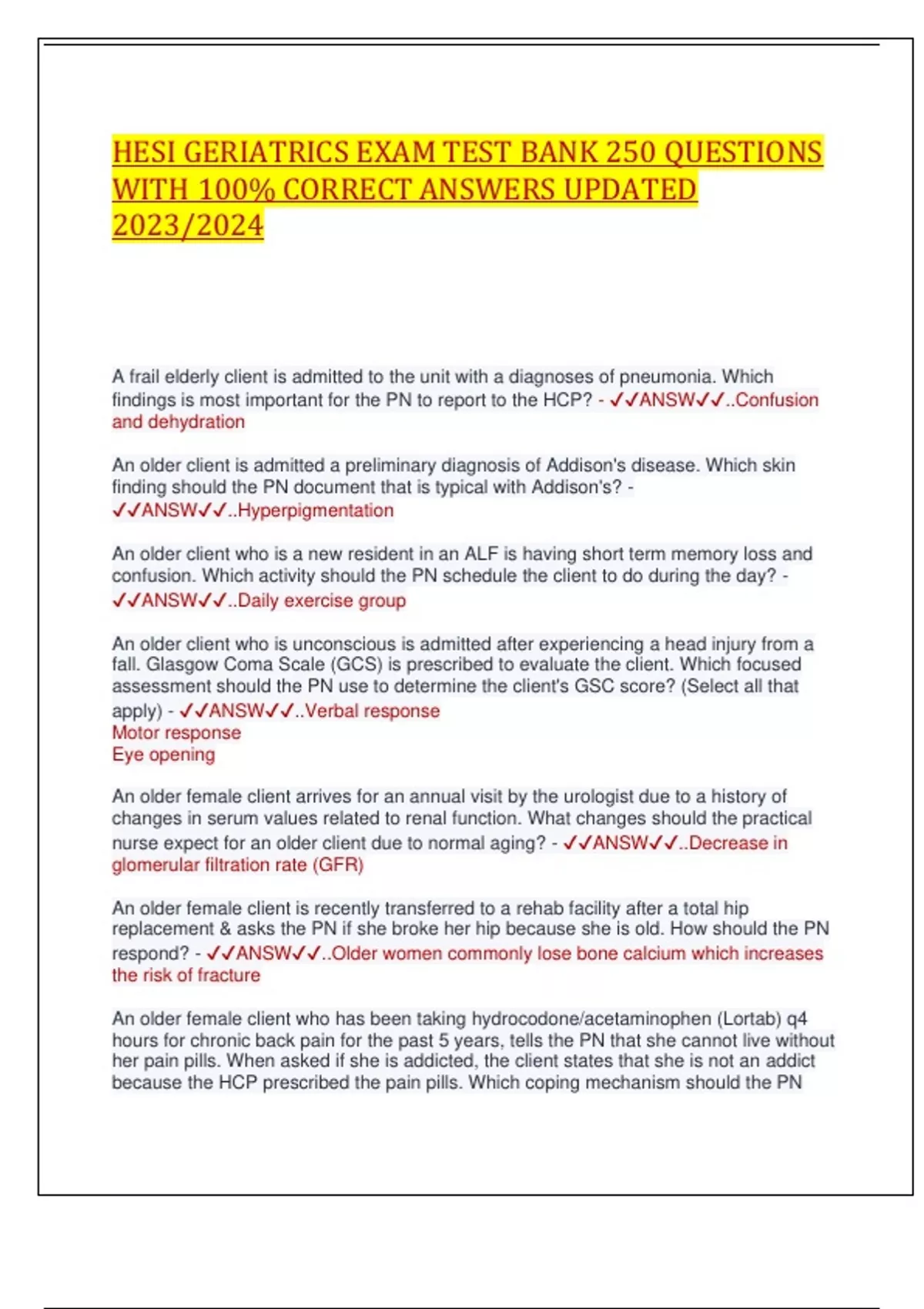 HESI GERIATRICS EXAM TEST BANK 250 QUESTIONS WITH 100% CORRECT ANSWERS UPDATED 2023/2024