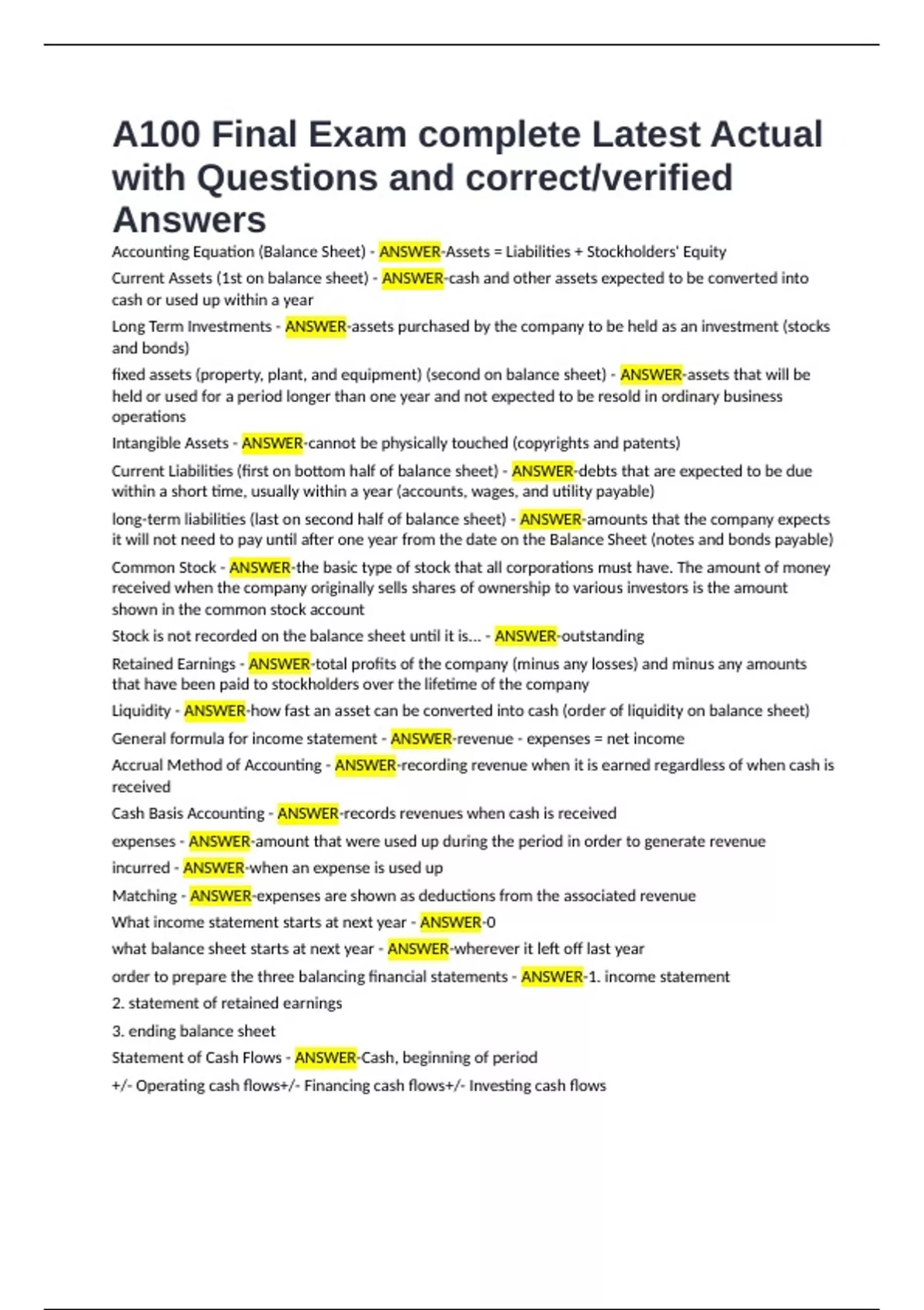 A100 IU Final Complete Latest Actual set with Questions and correct/verified Answers