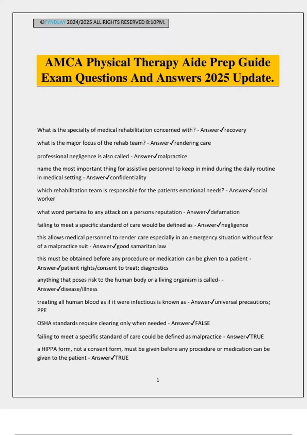 AMCA Physical Therapy Aide Prep Guide Exam Questions And Answers 2025 Update.
