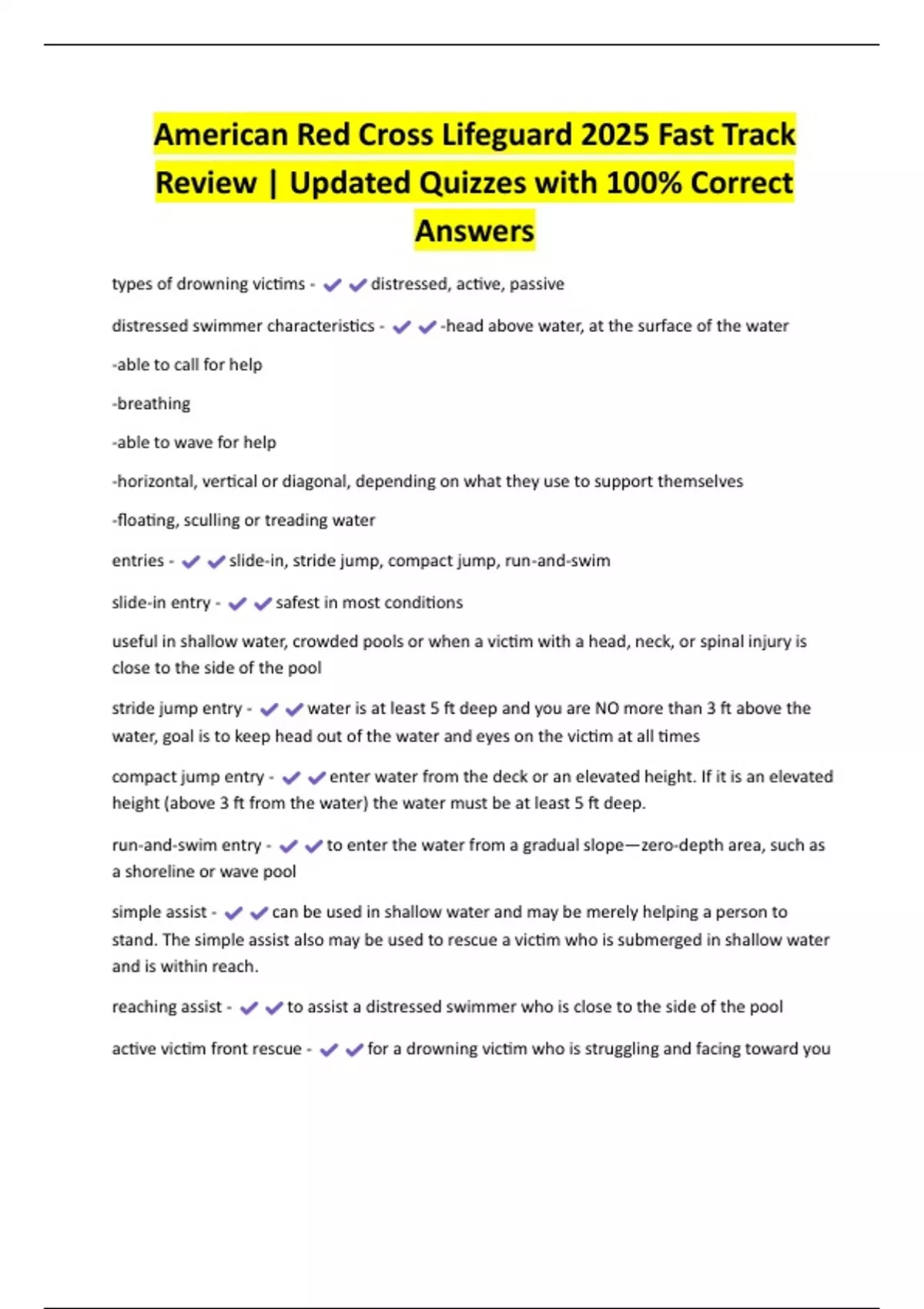 American Red Cross Lifeguard 2025 Fast Track Review | Updated Quizzes with 100% Correct Answers