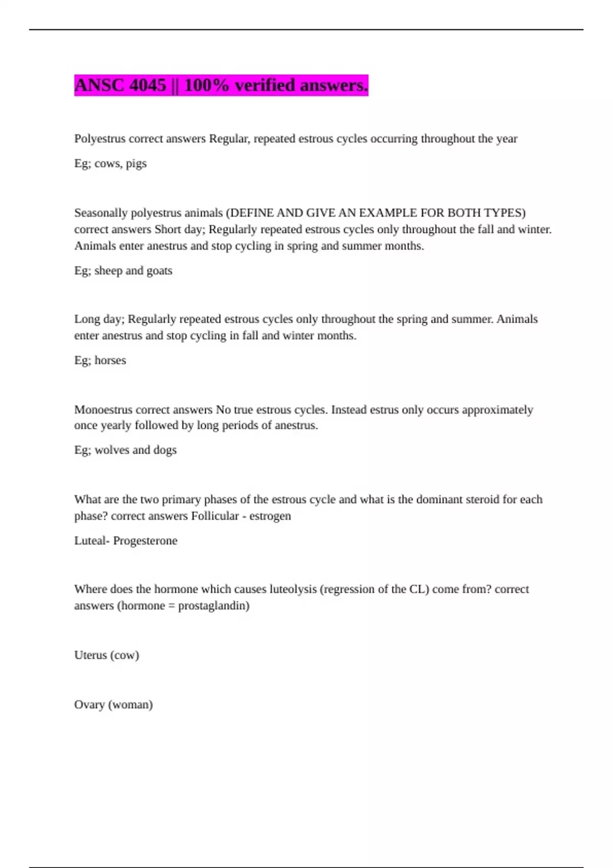 ANSC 4045 Reproductive Cyclicity (Quiz 3, Test 2) || correct answers 100%.