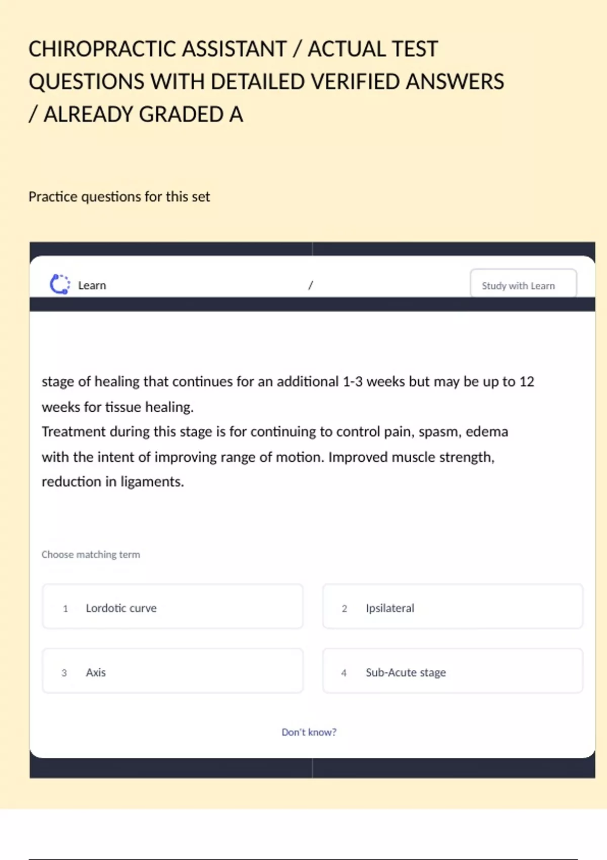 CHIROPRACTIC ASSISTANT / ACTUAL TEST QUESTIONS WITH DETAILED VERIFIED ANSWERS / ALREADY GRADED A