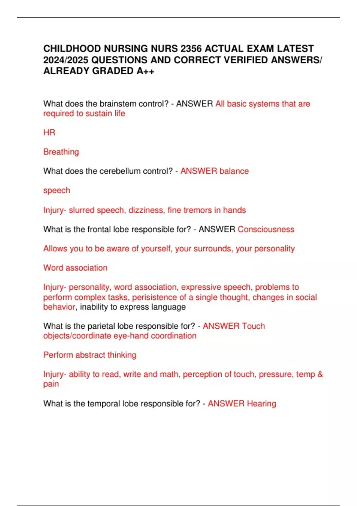 CHILDHOOD NURSING NURS 2356 ACTUAL EXAM LATEST 2024/2025 QUESTIONS AND CORRECT VERIFIED ANSWERS/ ALREADY GRADED A++